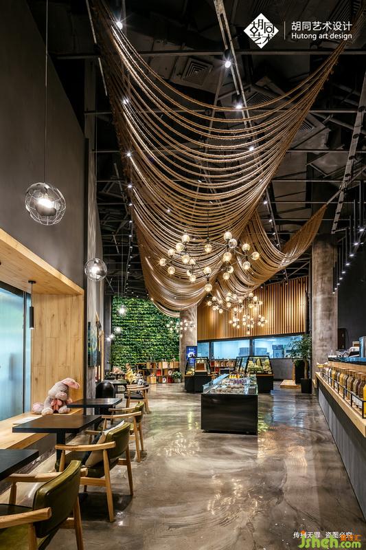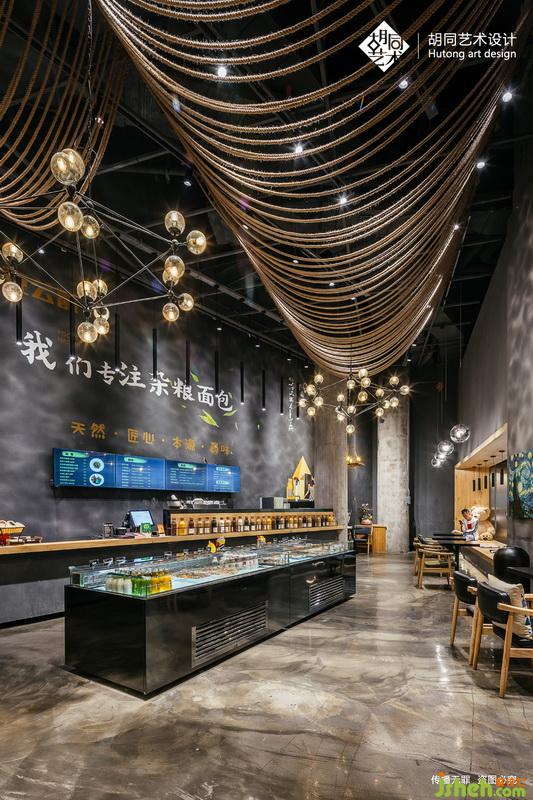 選用最深處做廚房,一可以用到不利于前場(chǎng)經(jīng)營(yíng)的地方,二可以增加展示面營(yíng)造整體氛圍。頂面除去設(shè)備高低也有6米,用麻繩裝置可以突顯整體效果,還可以最大限度節(jié)省成本。高低度可以又可適當(dāng)調(diào)節(jié)。餐廳設(shè)計(jì)地面為環(huán)氧地坪,配合整體做成灰色。墻面基本也是深灰色整體工業(yè)風(fēng)。整個(gè)展示面做開放式處理,既可以讓客人最大限度的看到內(nèi)部,也可以提供不一樣的休息體驗(yàn)。內(nèi)可閑暇暢聊,外可手握咖啡獨(dú)自發(fā)呆。