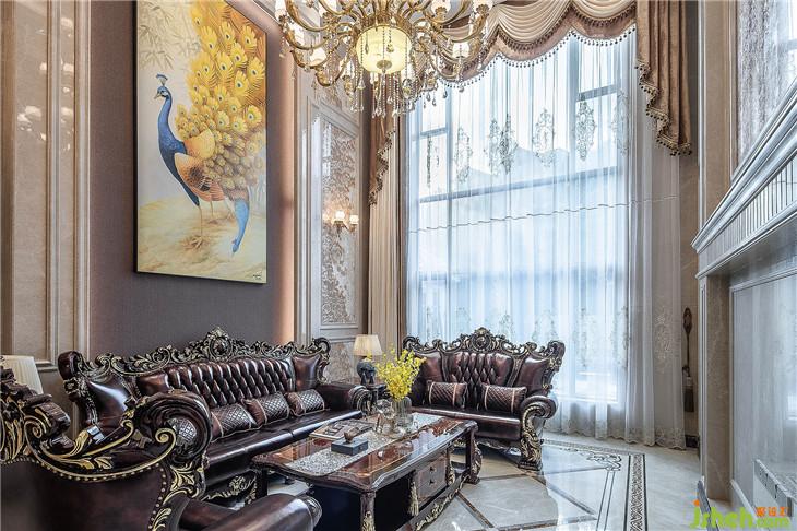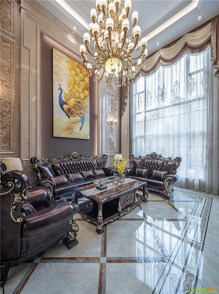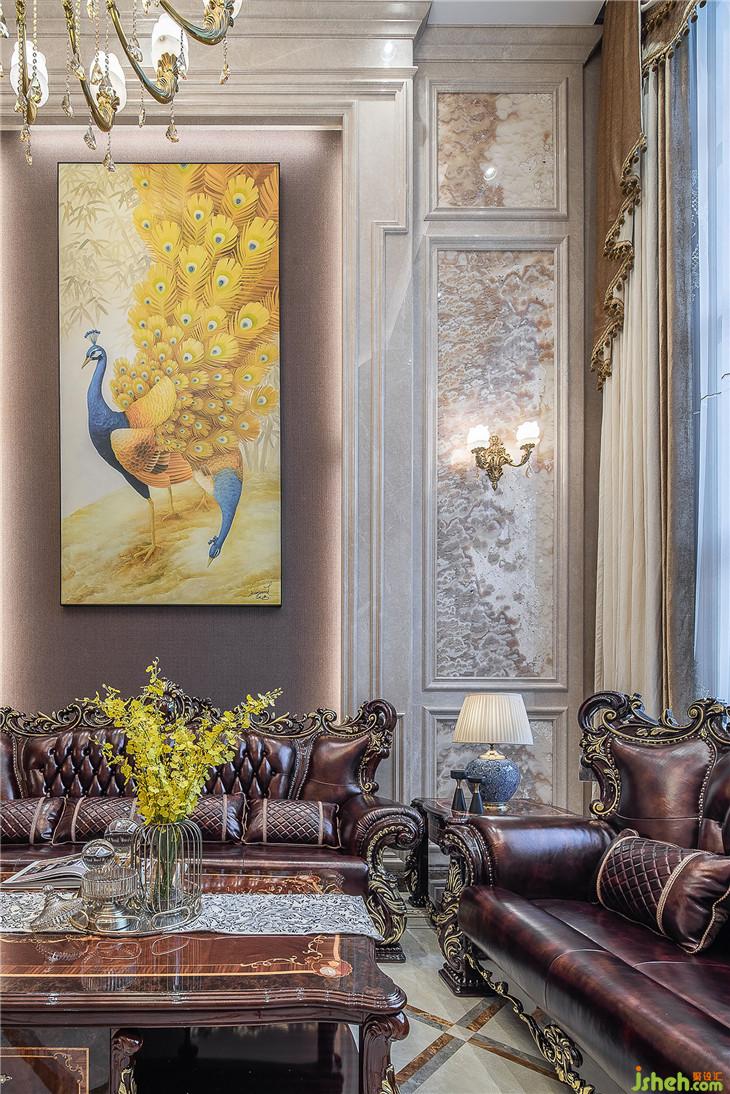 材質(zhì)運用上,同色系軟包背景墻銜接大面積的石材墻面,延展空間尺度的同時,充滿轉(zhuǎn)折的美感。深褐色的沙發(fā)擺放在一幅孔雀掛畫前,整個空間的色彩層次豐富明朗。