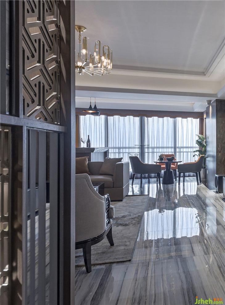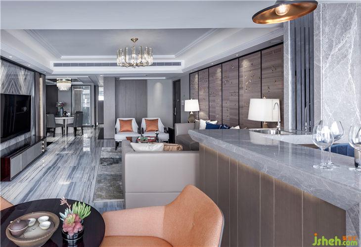 打通陽臺(tái)作為吧臺(tái)休閑區(qū)設(shè)置,通過主體、功能位置、通透的序列式的立面關(guān)系,自然分割空間視覺,同時(shí)又實(shí)現(xiàn)了將光線引入到室內(nèi)的最大化,讓空間極具延展性。