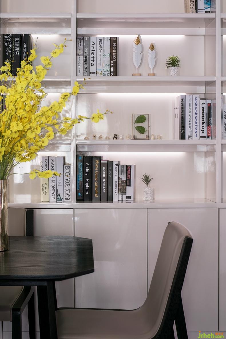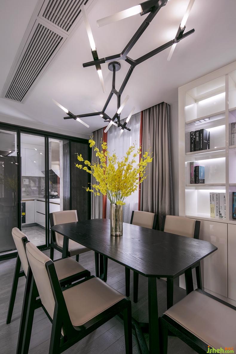 透過一扇落地玻璃的隔斷,是選自木制餐桌的樸質(zhì)生活。線條感的燈飾、亞麻色的窗簾與客廳、廚房的設(shè)計相互輝映。室內(nèi)設(shè)計師餐邊柜設(shè)計為到頂?shù)难b飾收納柜,內(nèi)嵌燈條的光線讓收藏的飾物更有展現(xiàn)視覺效果。