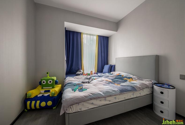 兒童房整體以灰調(diào)為主,與整屋的風(fēng)格相應(yīng)。而挑明一抹藍色的窗簾,選用藍與黃的搭配融入兒童房中,色彩鮮明的設(shè)計感更符合兒童成長心智。別致的飄窗設(shè)計,會是兒童休閑娛樂的一片新天地。