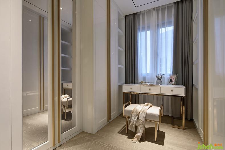 轉(zhuǎn)眼進(jìn)去的是主臥房的衣帽間,在設(shè)計上,室內(nèi)設(shè)計師除了能大量的收納放置衣物用品之外,還在靠窗邊的位置為華太設(shè)計了精美的梳妝臺。