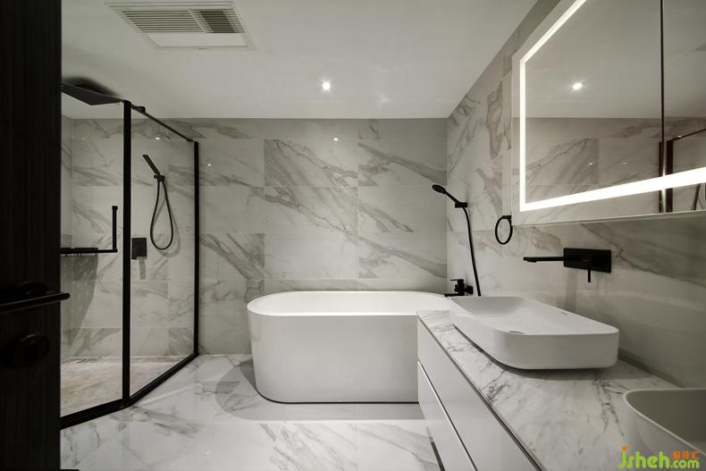 浴室的墻面以暗紋雪花白大理石墻面為主,搭配高品質(zhì)的浴缸、浴室柜、淋浴間等衛(wèi)浴用品。