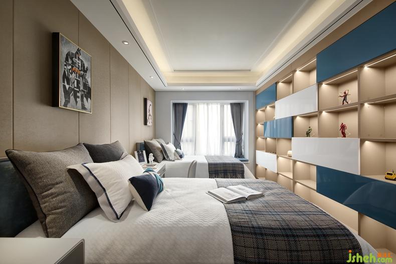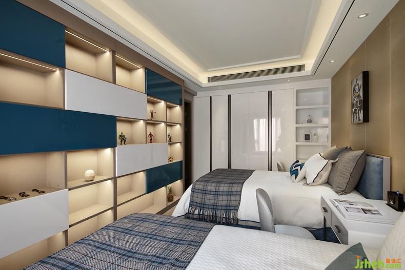 采用了整體墻面柜體的設(shè)計,集展示型書柜和儲物功能于一體,使整個空間看起來更為整潔得體。而房間的整體布局都是以藍(lán)調(diào)為主,安謐深邃的色調(diào)是學(xué)習(xí)成長的興致。