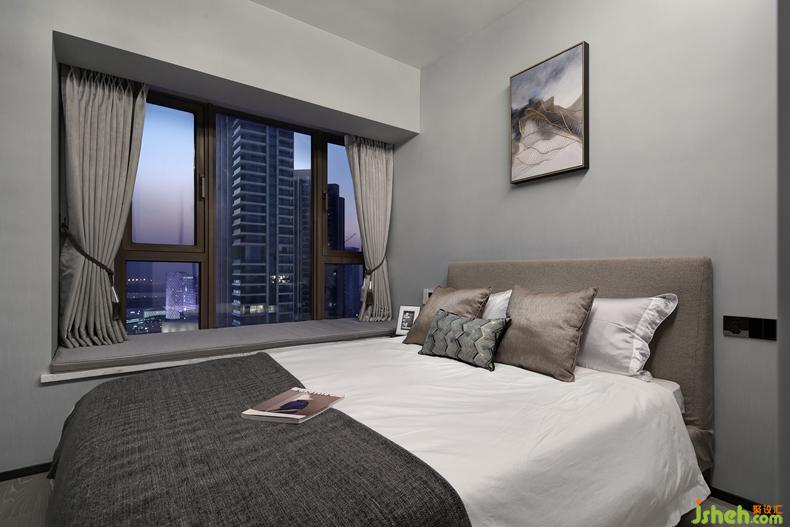 預(yù)留多了一間次臥室,同樣以灰調(diào)為主色的空間,安靜而舒適。透過大飄窗看見的一抹彩霞,也是一刻對生活的享受。