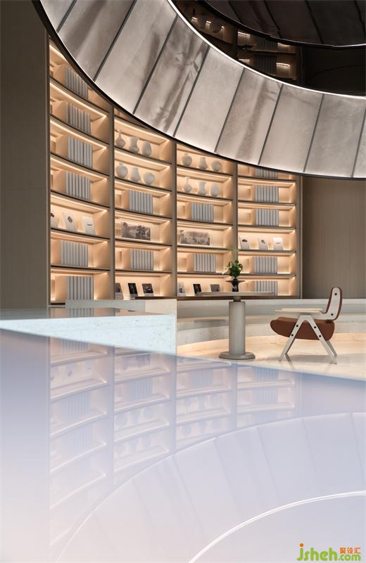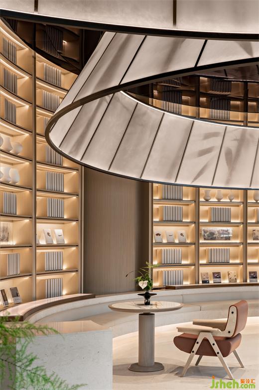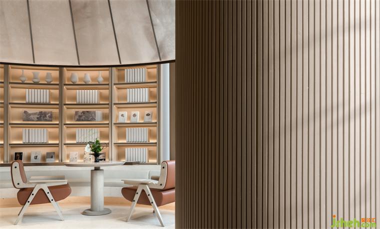 在視野向外的洽談區(qū),素潔的大理石面、光滑的皮質(zhì)單椅,裝修公司皆以質(zhì)地的潔然觀感匹配空間體驗(yàn)的素雅之貌,一瞥朱紅溫而啞,一片日光柔而輕,共同承載空間的人文厚意。