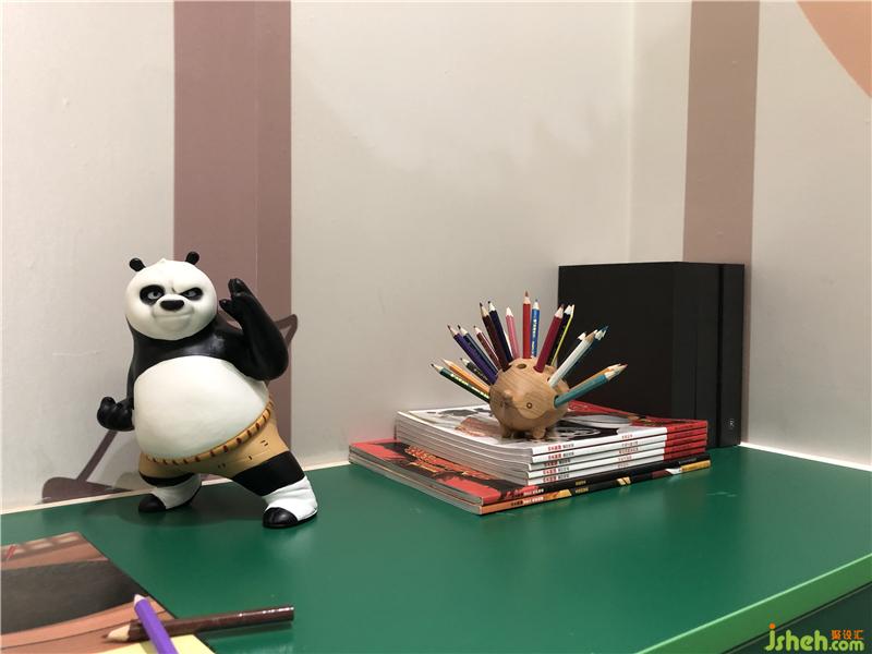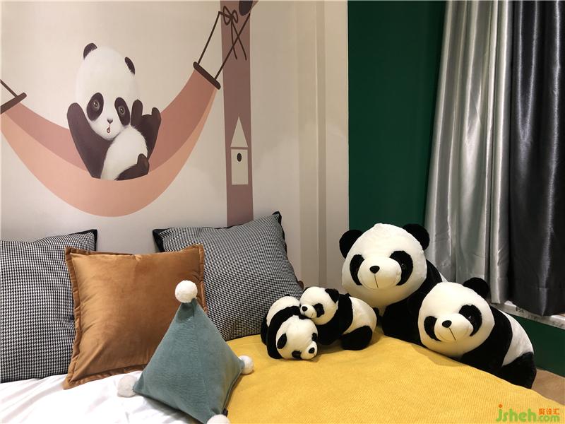 兒童房將童趣進(jìn)行到底,可愛的熊抱玩偶與功夫熊抱擺件,還有墻上的熊貓裝飾畫,讓整個(gè)樣板房設(shè)計(jì)房間充滿萌趣。黃與綠的大膽撞色,營造出童話般的小小世界。