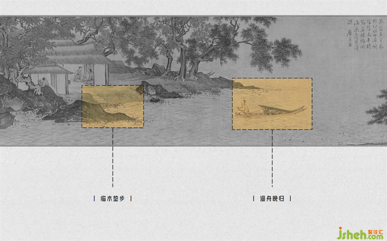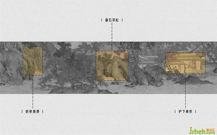 本案銷售中心設(shè)計靈感源自唐代著名畫家唐寅晚年的作品《溪山漁隱圖》。此畫描繪了唐寅在經(jīng)歷世間紛擾后,回到姑蘇城后,對悠靜自然生活的向往和追求。這與此次項目的定位相契合——創(chuàng)造一個身處繁華世界中,卻能保持內(nèi)心平靜的精神港灣。“入則靜謐,出則繁華”,我們以此為理念,通過深入挖掘畫中的每個細(xì)節(jié),構(gòu)建不同功能空間的設(shè)計方案。