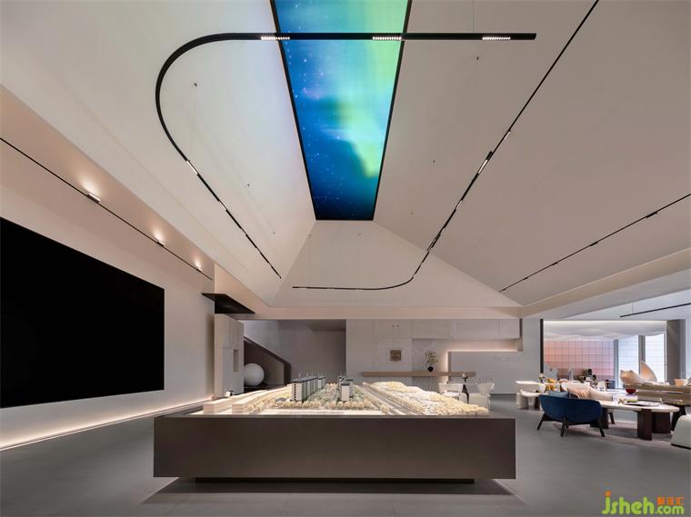 沙盤區(qū)頂部采用茅屋的梯形結(jié)構(gòu),模擬鏤空效果,體現(xiàn)出傳統(tǒng)建筑的美學(xué)特點,讓空間結(jié)構(gòu)看起來更加輕盈和自由。銷售中心設(shè)計垂落的燈帶豐富空間的層次感,不再局限于傳統(tǒng)售樓處的展示模式,而是以一種更為靈活且富有創(chuàng)意的方式呈現(xiàn)。