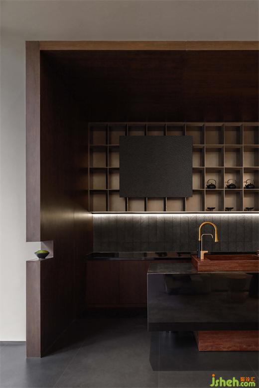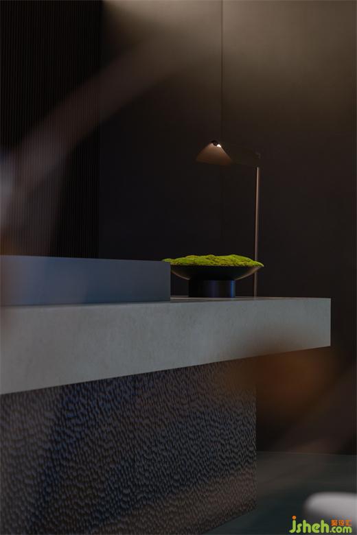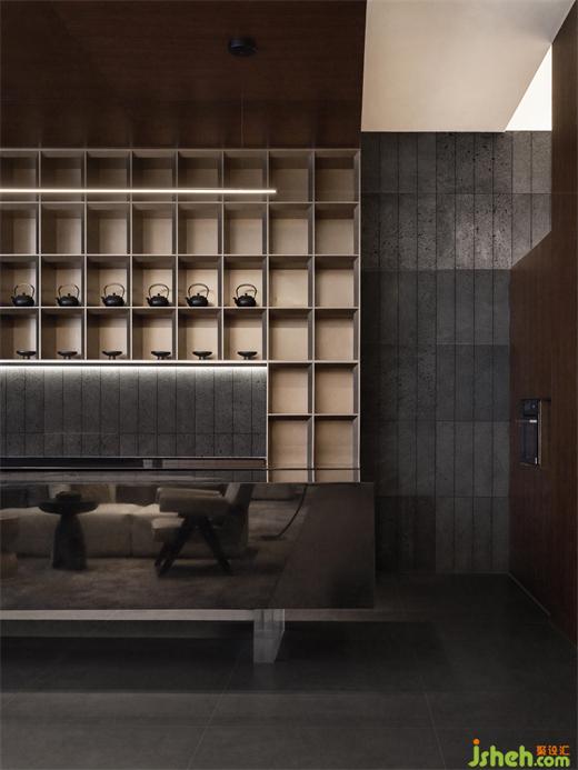 水吧臺處,茶道與品茗文化彌漫其中,營造“竹下忘言對紫茶,全勝羽客醉流霞”的風(fēng)雅氛圍,構(gòu)建出以姑蘇在地文化為基礎(chǔ)的獨特場域,融入現(xiàn)代審美觀念,使整個空間彌漫著東方韻味。深沉色調(diào)的水吧臺搭配井字格陳列柜,在滿足功能性的同時,也為人們營造了一個品味生活、體驗藝術(shù)的空間。