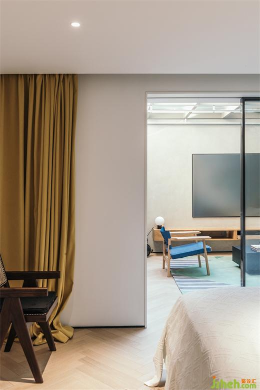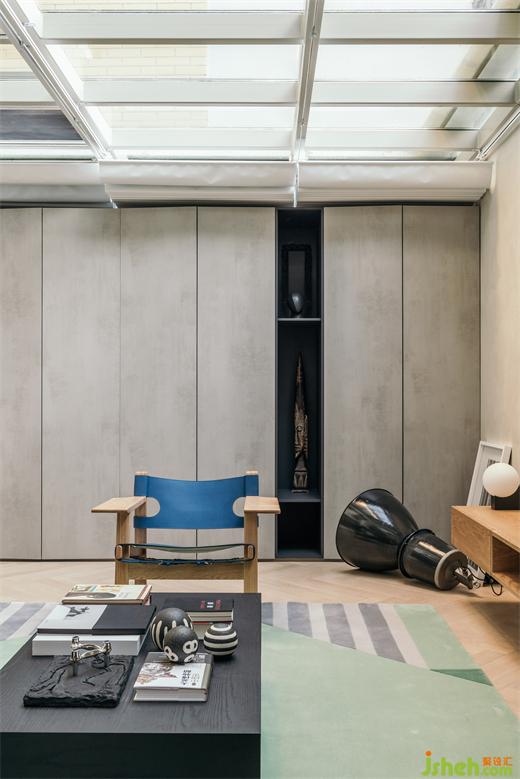 The top of the living room is clad in a glass canopy with bespoke motorized sunshades that can adjust daylight as required. A warm beam of yellow sunshine will pour into the living room in the afternoon, making it an extremely rare moment of relaxation. In the evenings, the space will be lit entirely by table lamps and floor lamps, which are also extremely romantic.