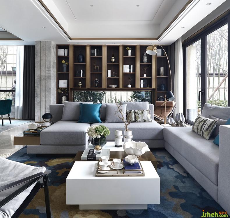 客廳的全景落地窗將景色最大限度地納入空間,開(kāi)闊明亮。家具的布局自由且活潑,扁平化的現(xiàn)代家具組合是國(guó)外的潮流趨勢(shì)。白玉大理石拼貼的電視機(jī)背景墻與臺(tái)面連為一體,簡(jiǎn)潔純粹,結(jié)合兩邊鍛打免銅板和嵌古銅金屬條的咖啡色墻布,又不失奢華大氣。書(shū)柜下方的透明壁櫥,像一面窗,打破書(shū)柜的死板閉塞,使內(nèi)部空間與外部庭院有了交流。隨意擺放的的各式鼓凳,不再講究配套一致,看似隨意的布局,反而增加了空間的自由個(gè)性。