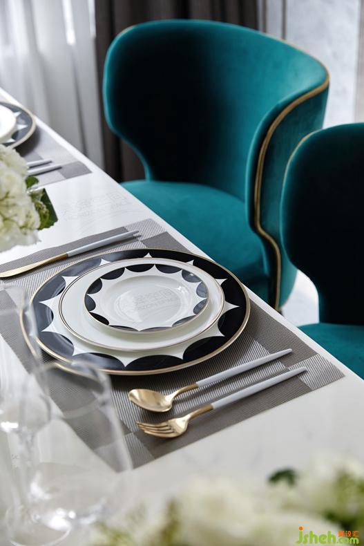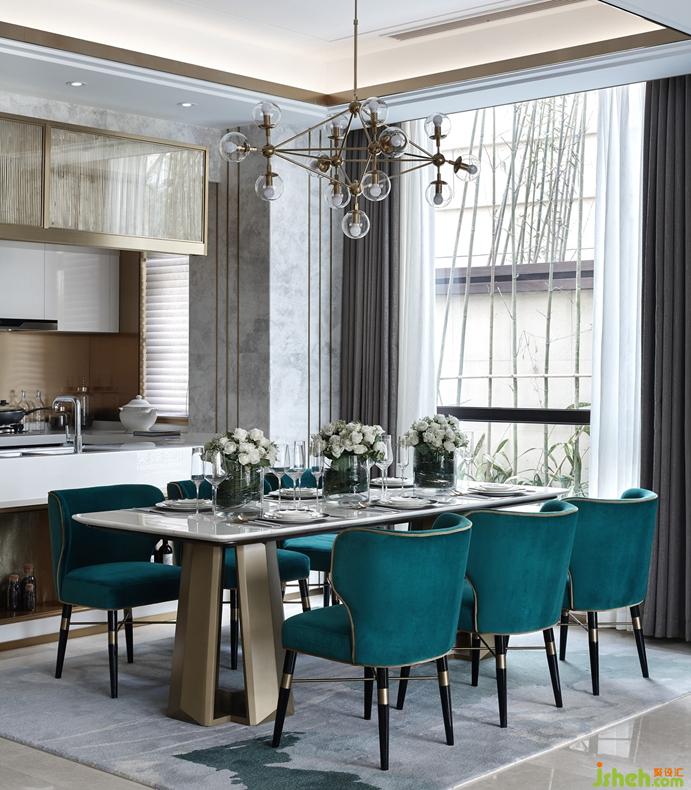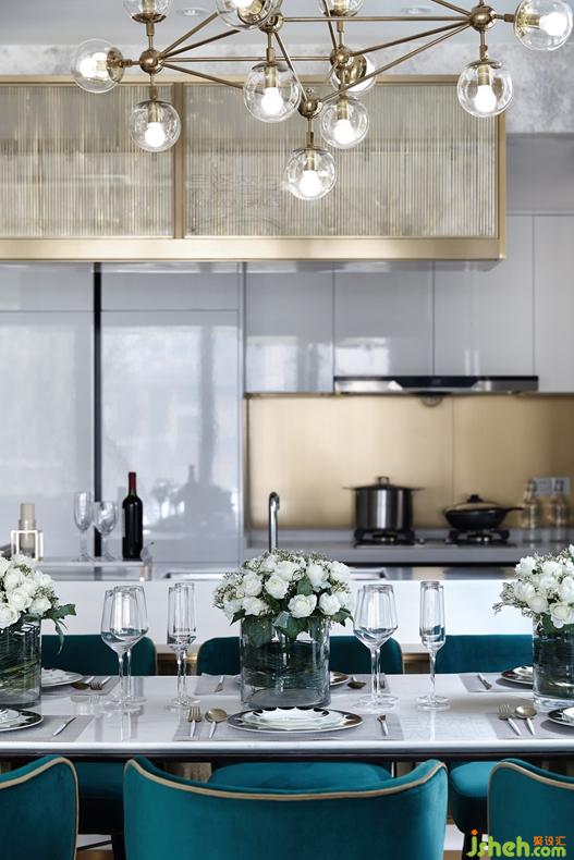 步入室內(nèi),開(kāi)放式的廚房、餐廳,在空間上和客廳融為一體,增強(qiáng)了空間的流通性。餐廳是優(yōu)雅的白金色調(diào),現(xiàn)代感十足,搭配深色的科定木飾面,孔雀綠的餐椅,給整個(gè)空間增添一絲時(shí)尚活力。半島式櫥柜臺(tái),是安吉爾白大理石和鍛打銅板的完美結(jié)合,既可作為西餐的操作臺(tái),又可以作為酒吧臺(tái),符合業(yè)主當(dāng)下的生活方式。來(lái)自德國(guó)的西門子的廚房電器設(shè)備,德國(guó)Hansgrohe的廚房抽拉式龍頭和科勒的廚房臺(tái)盆,盡顯高檔生活品質(zhì)。