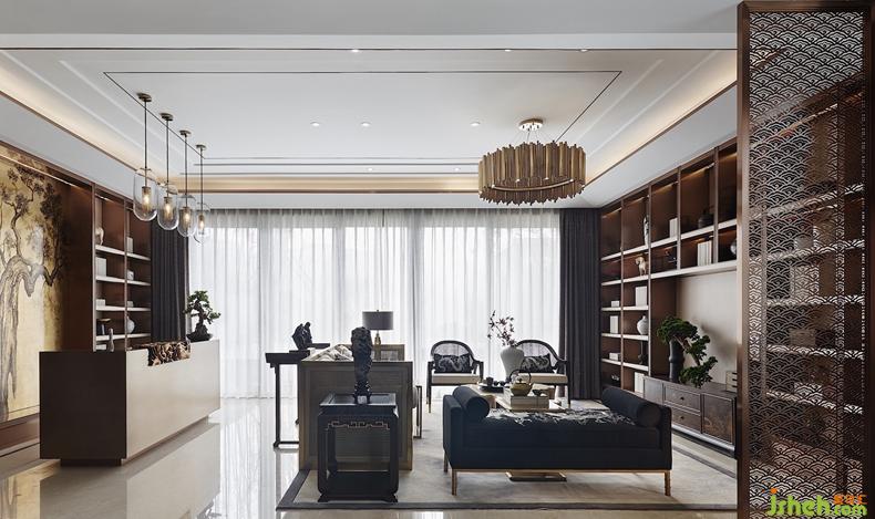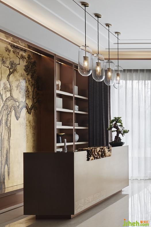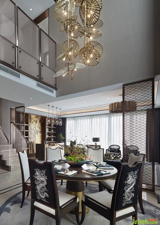 客廳布局方正,開闊明亮,全景落地窗將景色最大限度地納入空間,成為客廳中最搶眼的取景框。傳統(tǒng)的案幾,玲瓏的太湖石,李華弋的金箔畫,隨處可見的龍紋圖案等都在表達(dá)現(xiàn)代人對(duì)傳統(tǒng)、對(duì)中式的理解與體會(huì)。兩面的書柜是香檳玉大理石和拉絲古銅的完美結(jié)合,飾品精致,圖書琳瑯,營造出一種書香門第的氛圍。這樣的設(shè)計(jì)也符合業(yè)主的學(xué)識(shí)和品位。仿古銅的吧臺(tái)依靠特殊做舊工藝制造出隱隱約約的水墨圖案,又戲劇性地融合傳統(tǒng)紋樣的實(shí)木雕刻,造型新穎而獨(dú)特。抱枕和長榻的手工龍紋刺繡與電視柜的描金山水圖案互相呼應(yīng),不經(jīng)意間顯示出中式的華麗端莊。