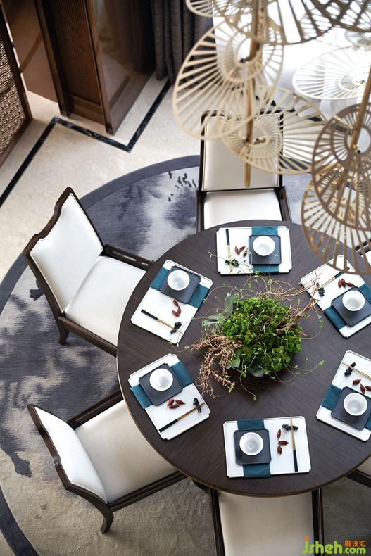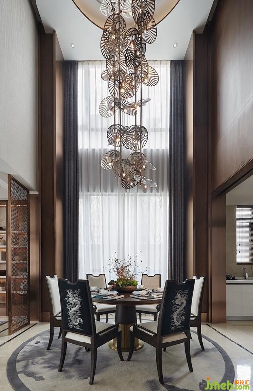 餐廳的天花運(yùn)用鏡面,使空間無限延伸,倒映出蒲扇組合的藝術(shù)裝置,仿佛是從天而降散落的花瓣,錯(cuò)落有致,別有一番趣味。挑高的餐廳空間透過大窗,可以看到月光,晚霞,竹林,怪石等景色。窗的兩邊伴有金屬的琥珀壁燈在柱上留下斑駁的光影,是中國傳統(tǒng)燈籠的演化。墻面是深色的科定木飾面,低調(diào)而深沉。餐椅背板的龍紋刺繡和精選水墨地毯詮釋著中式韻味。來自德國的西門子的廚房電器設(shè)備,德國Hansgrohe的廚房抽拉式龍頭和科勒的廚房臺(tái)盆,盡顯高檔生活品質(zhì)。