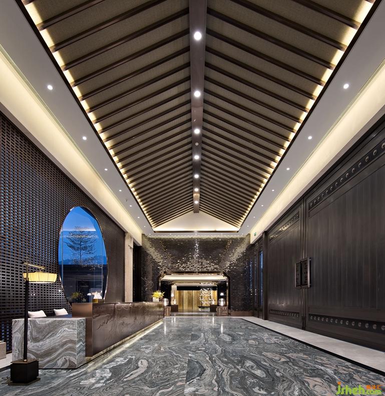 暖褐色金屬門樓,創(chuàng)造禮儀感與品質(zhì)感的營銷游覽動線。簡約大氣的冷灰色石材,流暢的水云紋理融入地面景觀空間,身處曲水流云的度假天境。入接待前廳,月洞形格柵屏風(fēng)運用中式園林框景手法把院落景觀映入眼簾。精選紫山水大理石與鍛打山水紋的古銅接待臺完美契合,尊貴而高雅用現(xiàn)代手法展現(xiàn)禪意韻律。