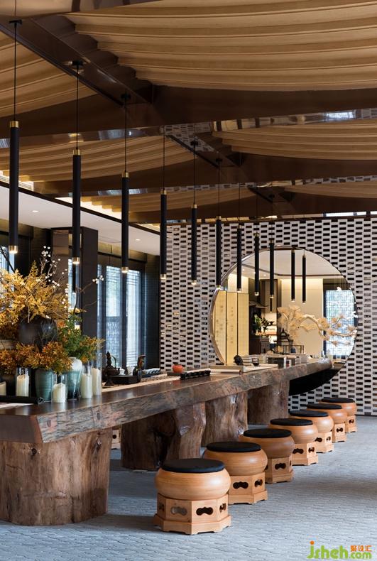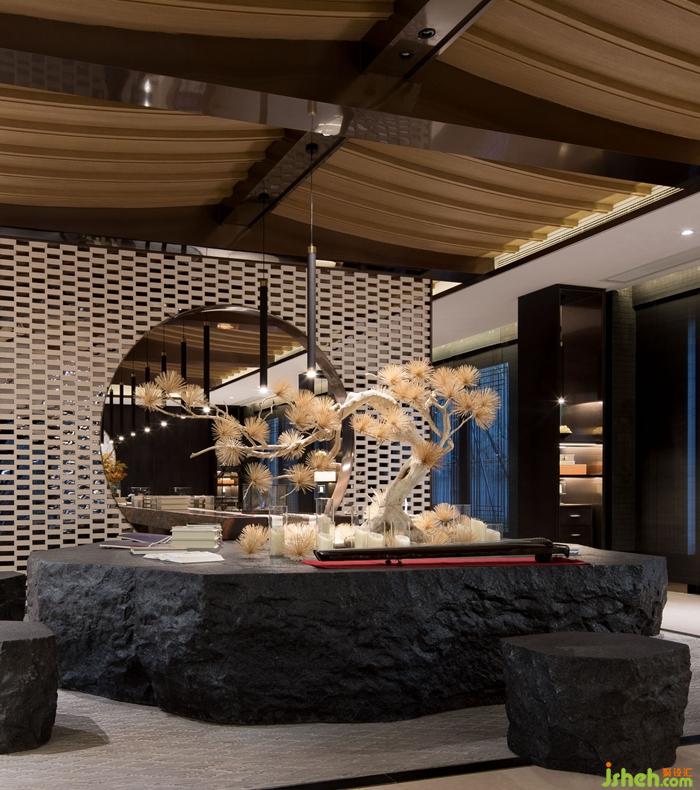 作為茶道、琴道、文化體驗的休閑區(qū),我們可以營造出東方意境的雅致生活。厚重的天然花崗石臺結(jié)合整版紅木茶臺穿過月洞穿插在一起。石臺上古松婀娜,端頭一組別致的花藝收尾。在這之間,撫琴,品茗,閱書,繪畫,樂享其中。