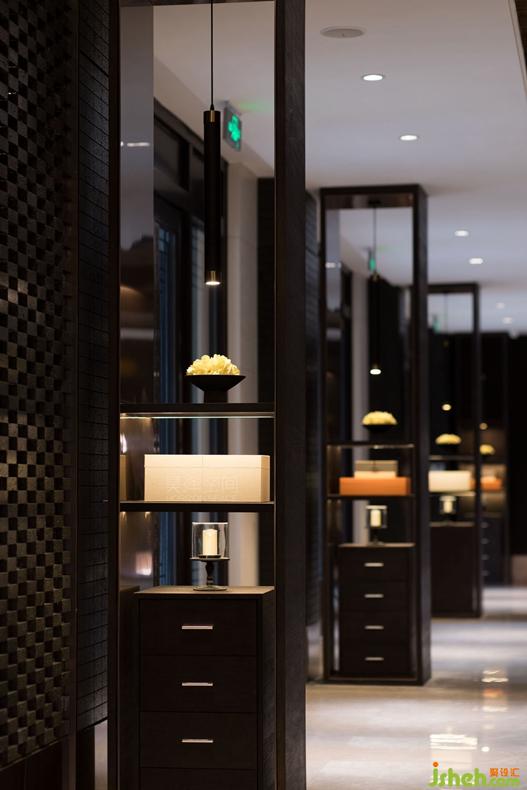 通過前后對應(yīng)月洞的形式,影影綽綽映出售樓沙盤區(qū)的熠熠星光。沙盤區(qū)取名“樓·碧云邊”,沙盤背景是三進的最后一道月洞格柵,結(jié)合起伏連綿的山形,恰到好處的提煉了主題,使之連貫不同的空間。在神韻上融會貫通,構(gòu)成層次豐富而統(tǒng)一的空間意象。