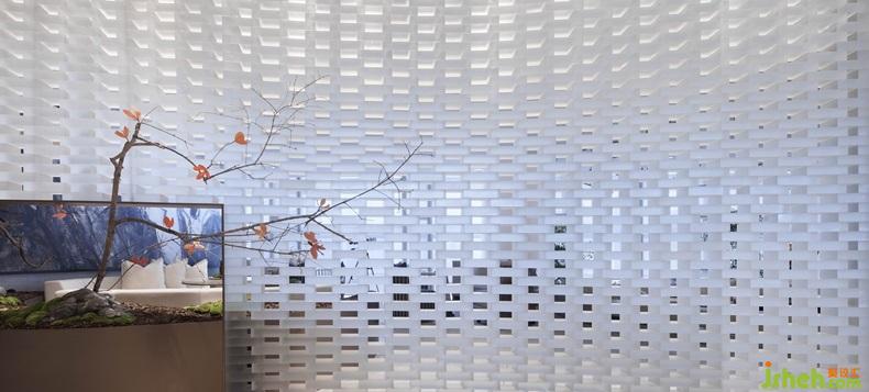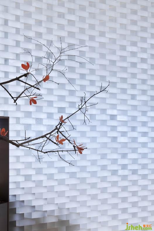 首先進入的空間是采用1800多塊特殊定制的冰晶琉璃磚圍合出來的弧型長廊,似隱還透,輕盈純靜,人影劃過,如音樂般律動。精心設(shè)計的15步行程,讓每個進來的人都在不自知中剝?nèi)ネ饷媸澜鐜淼母≡?,回歸平靜的本心狀態(tài)。