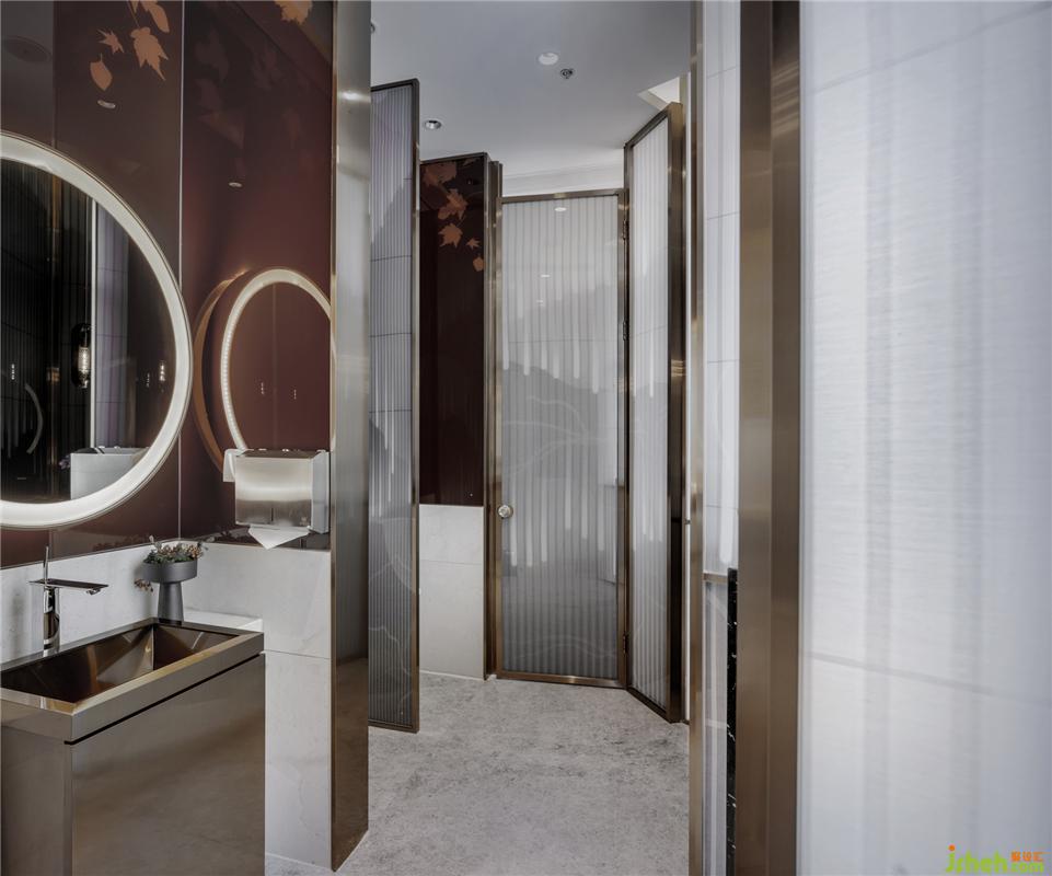 “池碎瀑聲荷捧雨,徑涵秋影篁篩月?!?nbsp;兼容中式美學(xué)與現(xiàn)代主義的極簡(jiǎn)法則,洗手臺(tái)的設(shè)計(jì)以朱紅與古銅、灰色與素白描繪空間。一輪圓月鏡將內(nèi)外的光景各自框成一幅畫面。