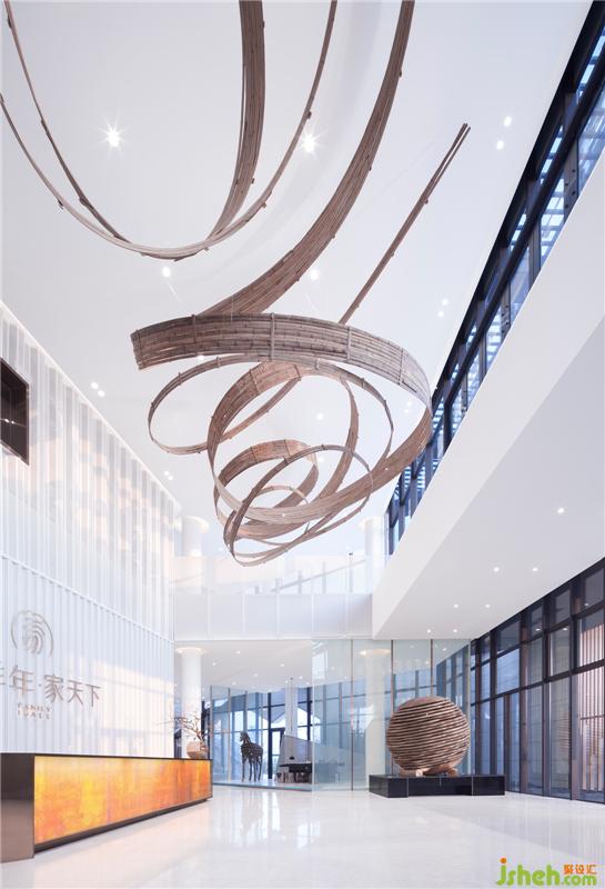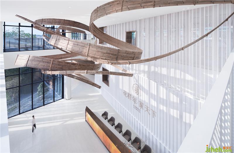 峽谷間應(yīng)型而就溪流以及峽谷間翻流沖突的煙霞風(fēng)云仿佛要掙脫峽谷型體界定的桎梏,為整個邏輯縝密和冷靜的空間帶來視覺震憾的強烈活力。(《風(fēng)來》大型藝術(shù)裝置是邀請非物質(zhì)文化傳承人采用民間竹制手工藝傳統(tǒng)技藝耗時一個月打造完成。)