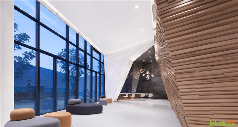 所有的峽谷(或圍屋)的表皮均采用白色沖孔鋁板,使整個空間既充滿豐富多變的層次,同時又輕盈、通透和消隱的未來感,再將圍屋上看似隨意的窗孔精心排布在墻體上,既可瞬間勾起體驗者的記憶溫情,又能營造出參觀動線上隨處借景,透景的園林意趣和豐富的空間層次。