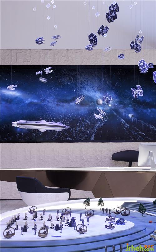 “星球大戰(zhàn)”三部曲的風(fēng)格視效貫穿了整個(gè)工作室空間,銀河系主題裝置和星戰(zhàn)對(duì)戰(zhàn)沙盤(pán)作為整個(gè)空間的視覺(jué)焦點(diǎn)。