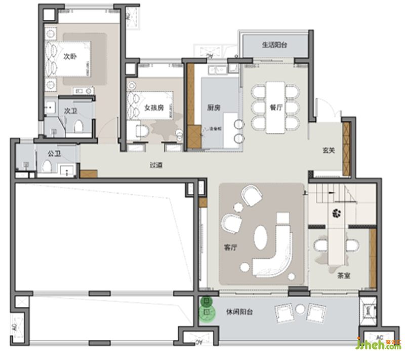 在自然的氣息中踩著輕松活力的節(jié)拍自由漫步。室內(nèi)空間使用大面積的木飾面,輔以高光通透灰色鏡面甩掉空間的壓迫感,再以明亮的綠、沉穩(wěn)的藍(lán)作為點綴之筆,刪繁就簡將自然元素融入空間之中,使整個空間生機(jī)盎然。