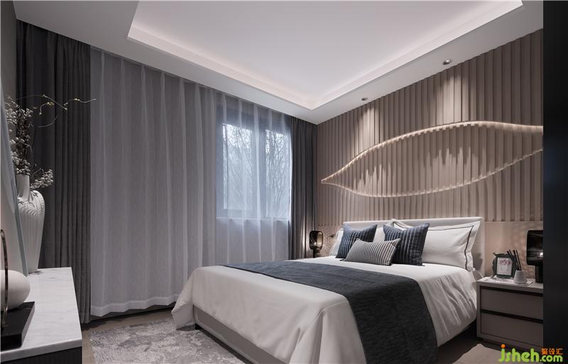 客臥采用簡單的線條木飾面做背景,簡約而不簡單,長沙樣板房設計窗簾與主臥采用統(tǒng)一色系,父母或朋友過來小住都非常合適。
