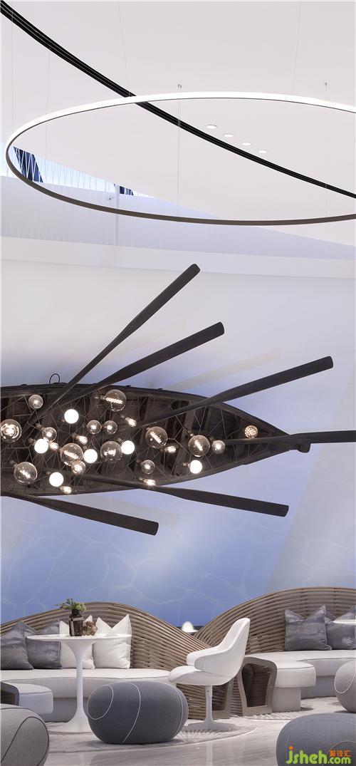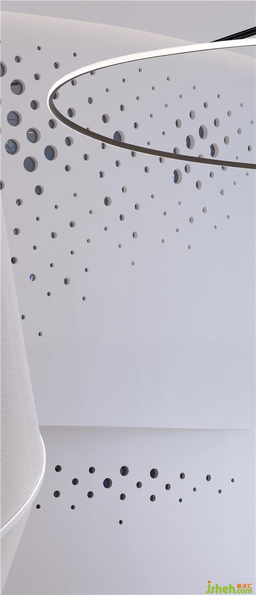 看似簡單的旋轉(zhuǎn)重復(fù),其實是在不同的維度上不停的迭代重生,所以圍繞著中心圓形的“鳳凰之眼”,售樓處設(shè)計我們營造了輕盈如飄帶般的莫比斯環(huán),每一個進入藝術(shù)中心的人在環(huán)形的空間中參觀游走時,都是圍繞著它,并且它仿佛是不停地在旋轉(zhuǎn)向上,給人很生生不息的心理體驗感。