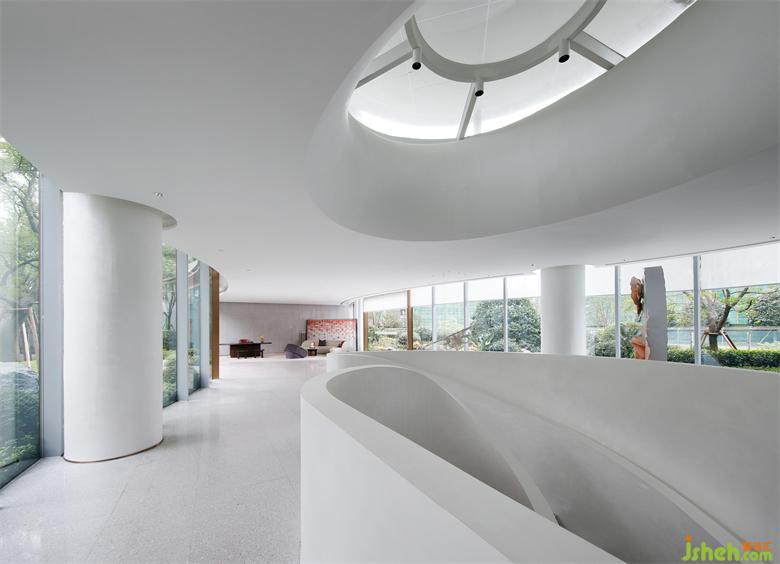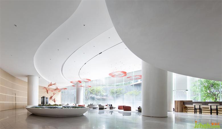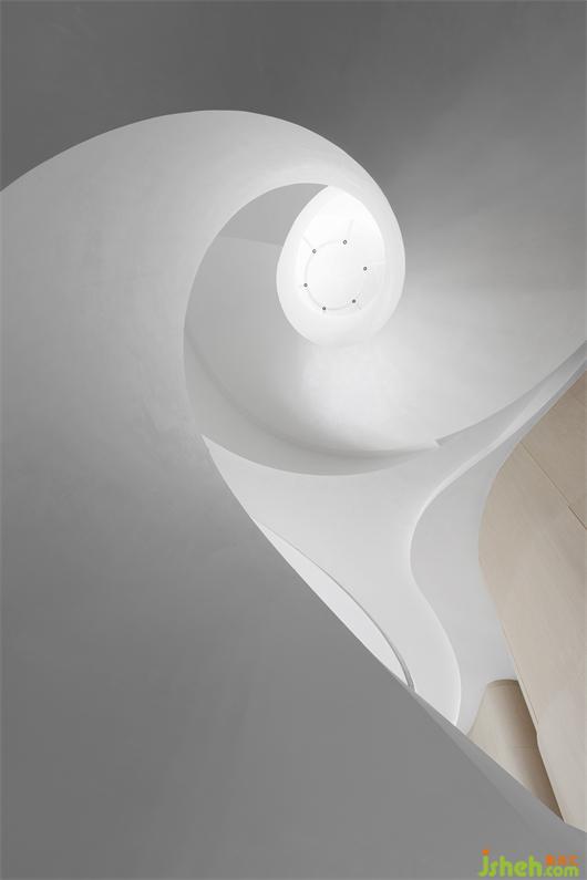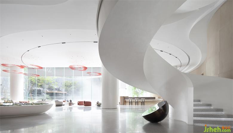 而整個(gè)接待廳屬于純儀式感的空間,設(shè)計(jì)上借文人山水畫中的彩虹橋,售樓處設(shè)計(jì)用現(xiàn)代簡潔的設(shè)計(jì)語言演繹為在天花開天窗與旋轉(zhuǎn)樓梯相呼應(yīng),象征著通向新世界的橋梁(別有洞天)。