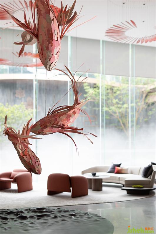 空間聯(lián)想古人雅致的生活方式,將曲水流觴的詩意形式在空間中展開,一種曲水般的線條形式由天花貫穿至墻面。而墻面層層疊疊的燈帶造型設(shè)計(jì)靈感來源于竹子豎向排列的竹節(jié),整個(gè)弧形墻面猶如一片寂靜的竹海給人一種放松的、舒適的包裹感,同時(shí)寓意著淡泊、清高、正直的人格追求,也是西貴的文人氣節(jié)。