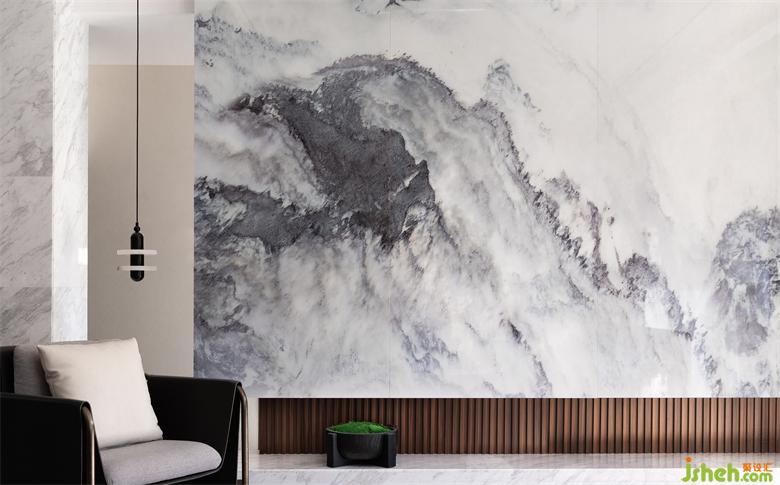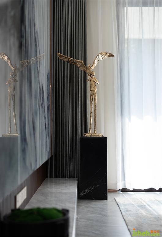 客廳,內(nèi)在山水,形影自成,取一幅山水畫巖為序,別墅設(shè)計(jì)采用“隔而不斷”的方式構(gòu)筑室內(nèi)外的微妙聯(lián)結(jié),我們將電視背墻與老人房墻體中僅余的一小段非承重墻打通;促成空間彼此滲透的“借景”,開放式書房鋪一箋素紙,研墨提筆,色侵書帙晚,隱過酒罅涼雨洗娟娟凈,風(fēng)吹細(xì)細(xì)香。