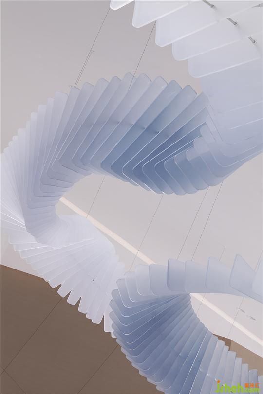 我們在連接產(chǎn)業(yè)板塊和住宅板塊的長廊上空做了一個大型藝術(shù)裝置《極光》,靈感來自于劉慈欣的短篇小說《夢之?!?,低溫藝術(shù)家以宇宙的尺度來創(chuàng)造藝術(shù)。我們用一片一片的亞克力創(chuàng)造了一個現(xiàn)實版的物化的、飄渺的、波光鱗鱗的、充滿神秘感的極光,寓意終極之美。