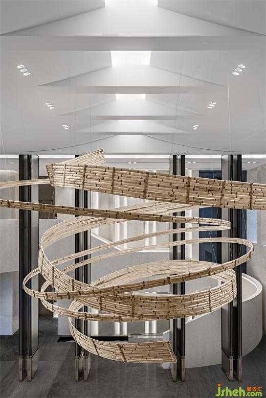 長沙售樓處設計以庭為廊,以水作徑,穿“愛晚”,越“風雩”,便至沙盤,圓形沙盤上方懸掛的大型竹編藝術裝置—《風來》,是邀請非物質(zhì)文化傳承人采用民間竹編手工傳統(tǒng)技藝耗時數(shù)月打造而成,仿若無形的空間能量在此翻滾騰躍,似云浪又似流水般在空間上方凝聚。