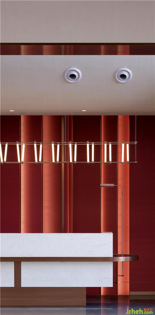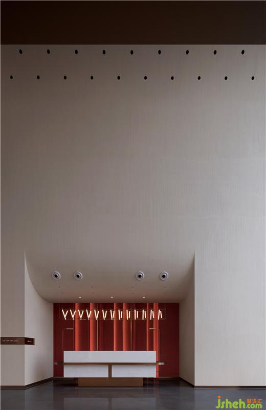 通高而高聳的前廳,接待臺背后紅色的摩素板,以及正面主背景仿佛宗教圖騰般的條形LED屏,無不天然的給人一種“神秘感”和“壓迫感”。