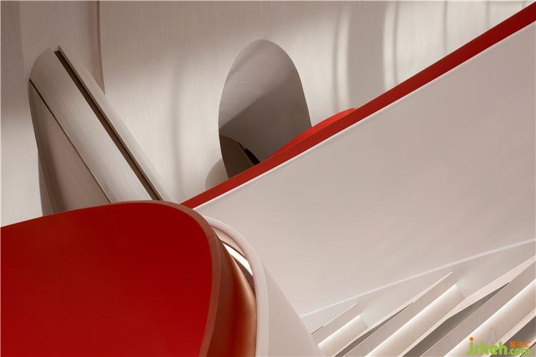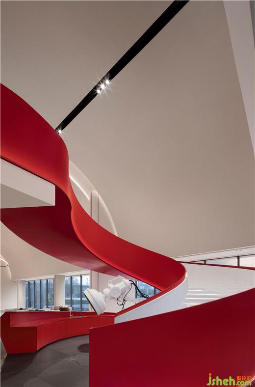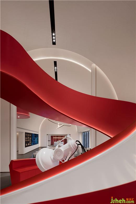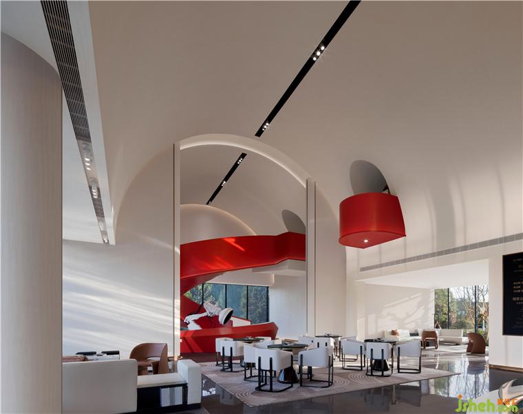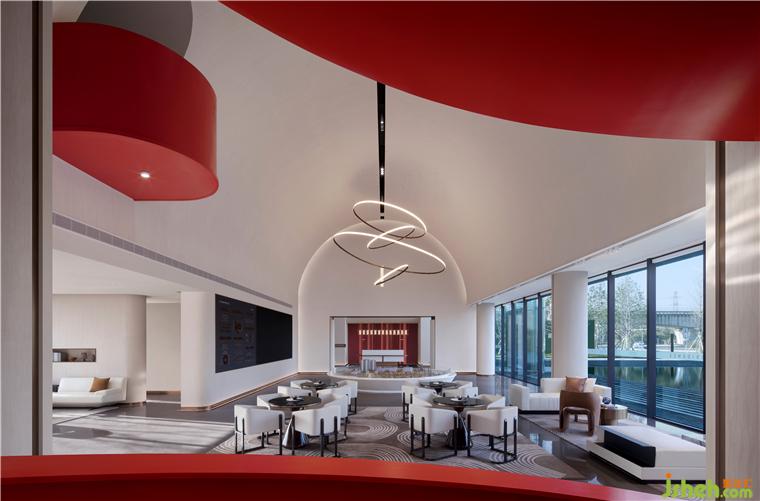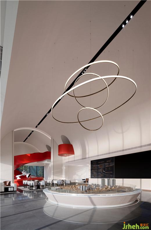 鮮艷的主題色在素雅的空間中分外奪目,整個主題造型好似飄帶,又宛若蛟龍,拔地而起,穿過連廊,再從洽談區(qū)這邊探出一截,售樓處設(shè)計不僅成為連接樓上樓下的紐帶,還以其優(yōu)美獨特的造型形成整個空間最重要的亮點。
