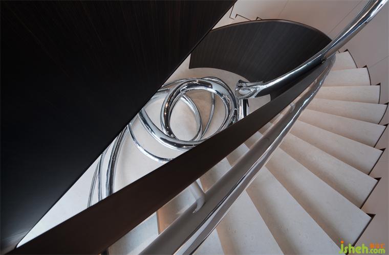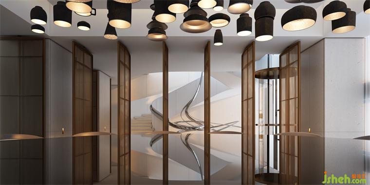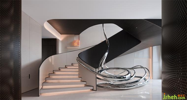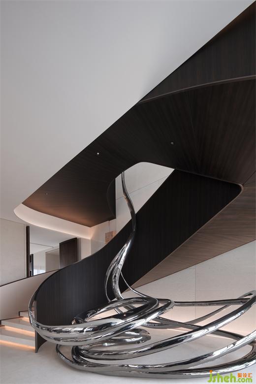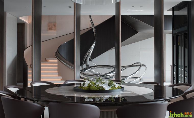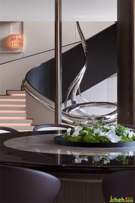 餐廳和樓梯之間用轉(zhuǎn)軸網(wǎng)眼銅屏風(fēng)間隔,開合之間,氣象森然。別墅裝飾大型雕塑與樓梯融為一體,名扶搖,取意李白唐詩-大鵬一日同風(fēng)起,扶搖直上九萬里。我問朋友,消隱于市是一和恒持的心境,待機(jī)扶搖也是吧?朋友笑而不語。