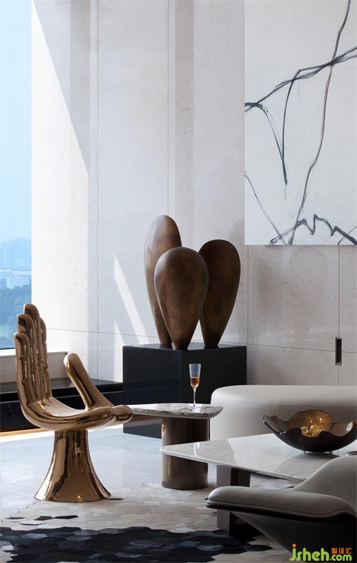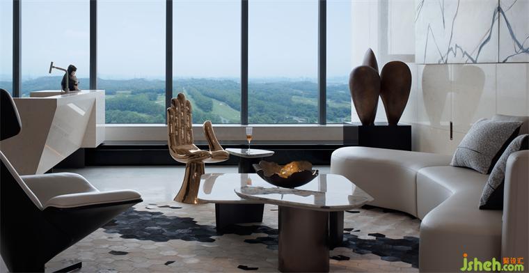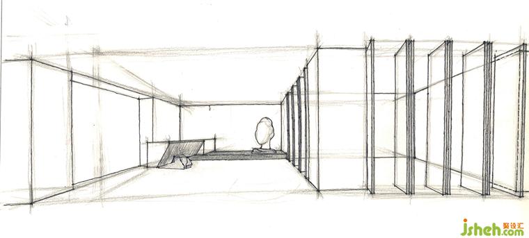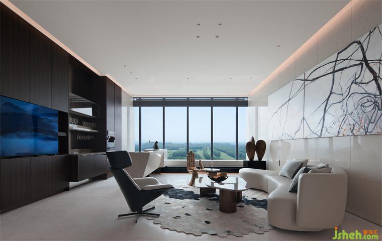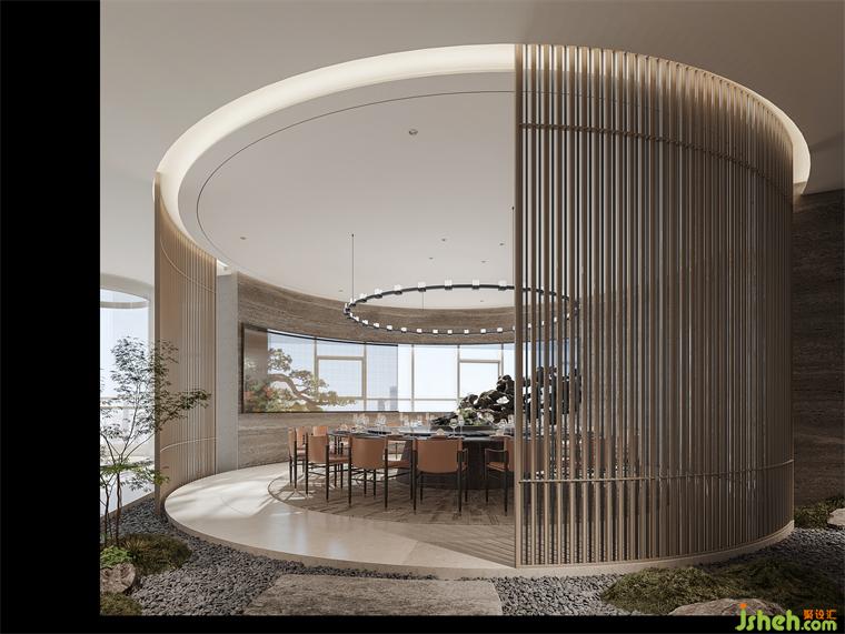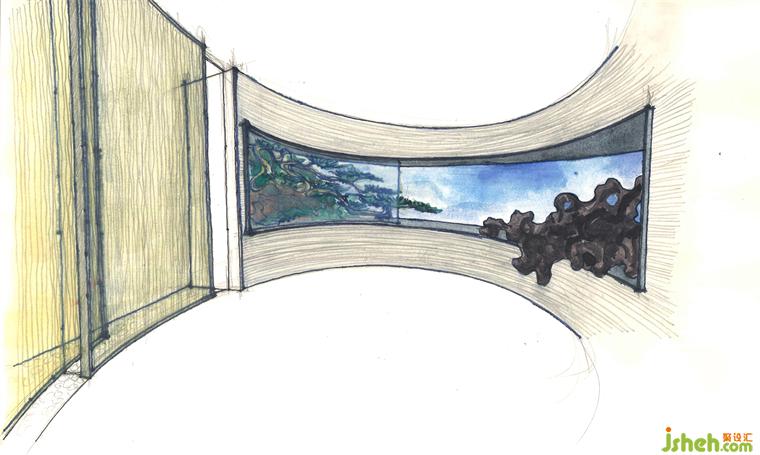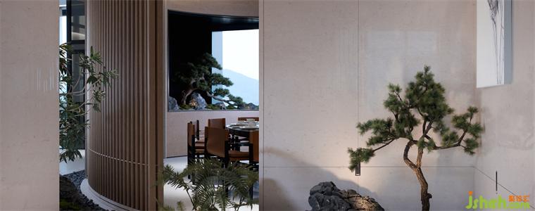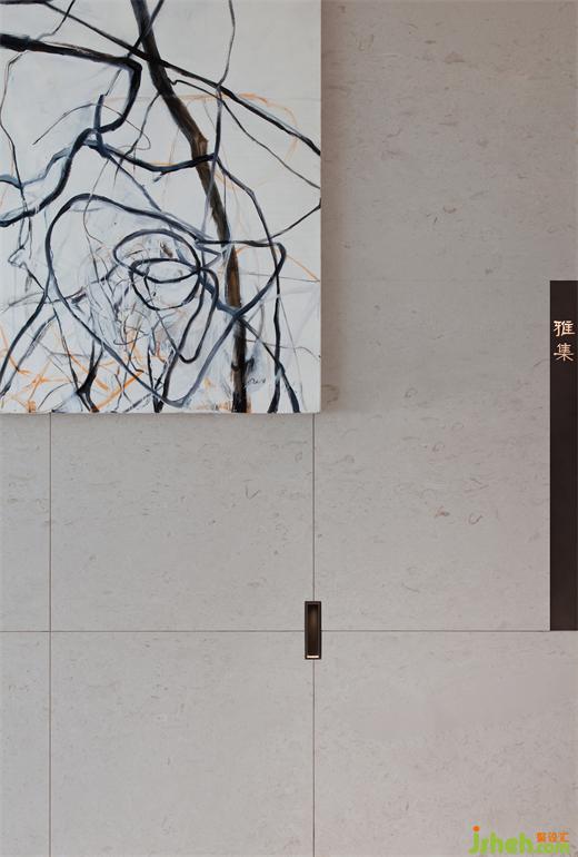 待客的中餐廳得走過一片園林,才得進入。虛掩的木格柵和夯實的土墻營造了野趣,開窗成了整個空間的魂。我用青松、怪石和窗外的遠山共同營建了一幅橫軸的《春松煙山圖》。別墅裝飾從外進入內,從內望向外,真實和圖像的映射交疊,使人進入亦真亦幻的古典意境。