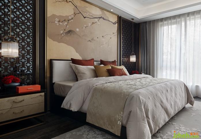 二樓的主臥的整體感覺延續(xù)一樓客餐廳的風格特色,鮮艷的杏黃,溫暖的米白,再搭配赭石色抱枕,花藝,色彩和諧統(tǒng)一。床背景是虛實結合的水墨山水和梅花,兩側同樣的深色格柵和銀鏡的結合,中式韻味十足。