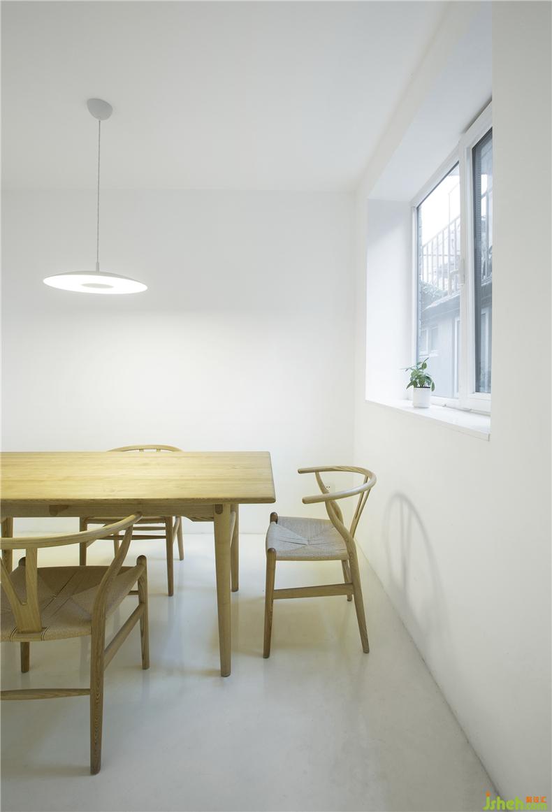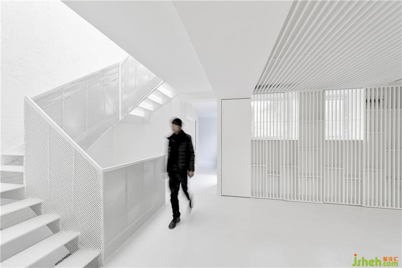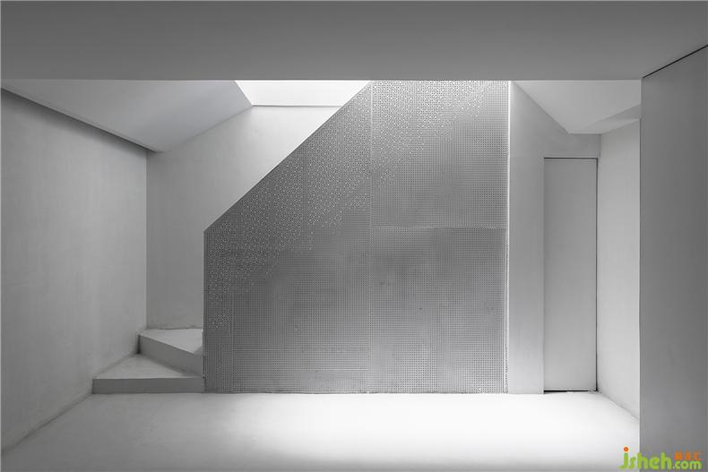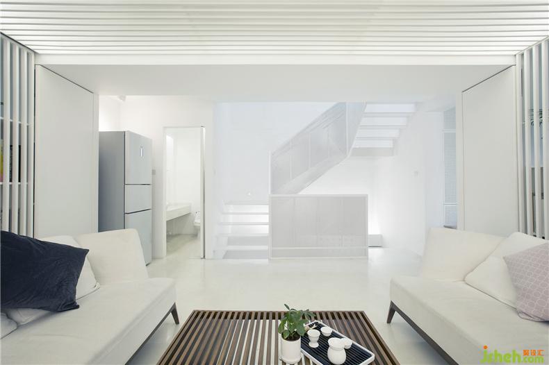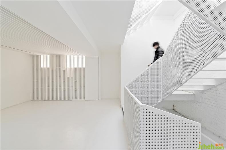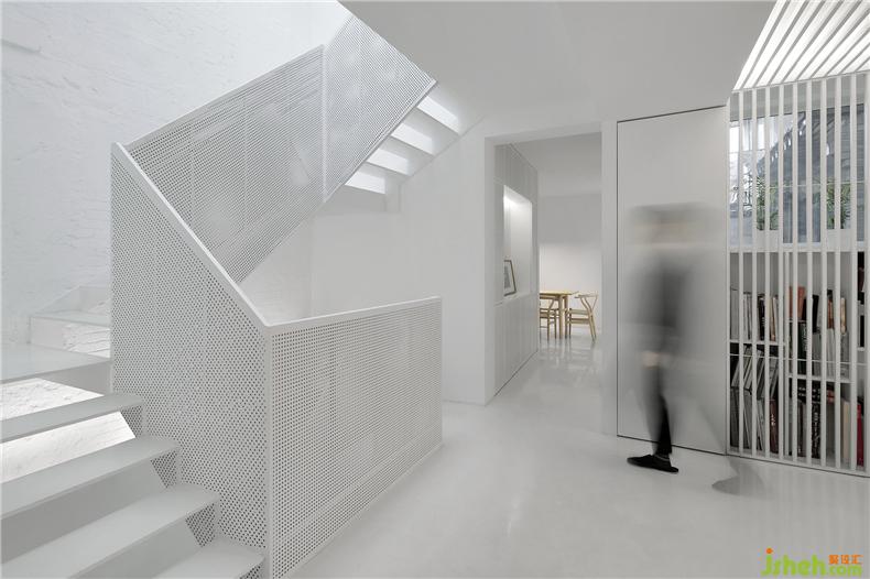 設(shè)計師的目標(biāo)是在舊建筑條件下改善內(nèi)部空間結(jié)構(gòu),別墅裝飾重塑光亮、透明、整潔的內(nèi)部空間氣息,與老街區(qū)外觀構(gòu)成有趣的反差。面對復(fù)雜瑣碎的現(xiàn)狀問題,設(shè)計師以“白”作為基調(diào),通過適當(dāng)?shù)牟鸪图咏ㄕ鲜覂?nèi)界面,使空間回復(fù)到一個純凈、抽象的初始狀態(tài),利用變化的光環(huán)境和室外景觀創(chuàng)造流動的空間感受。