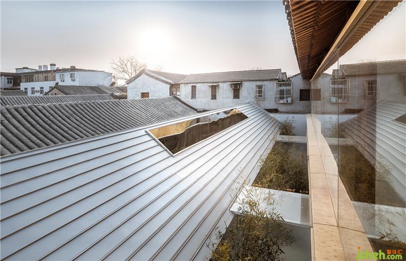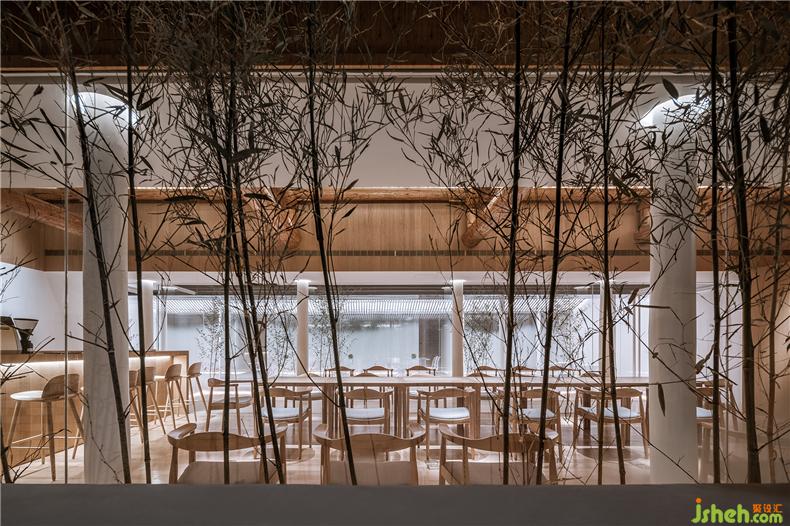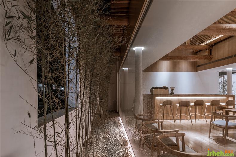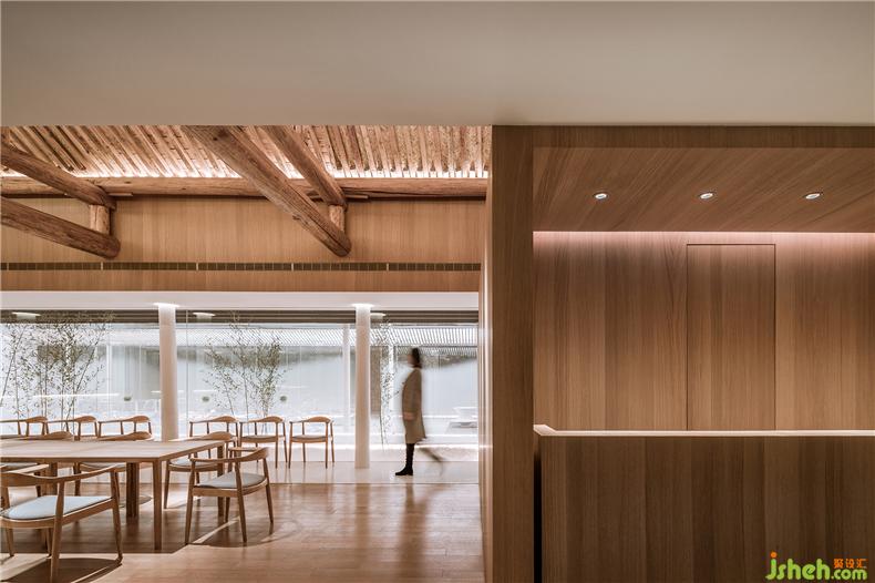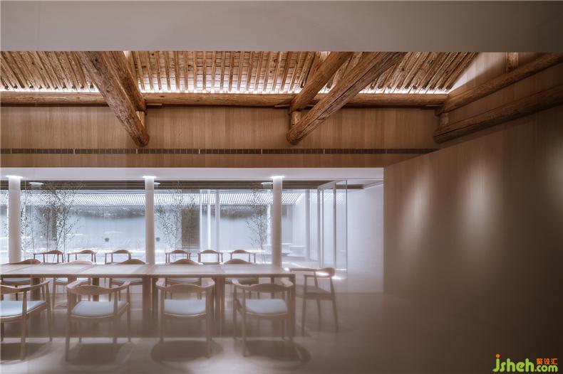 房屋的使用模式跟隨著三層庭院,會(huì)所設(shè)計(jì)自然產(chǎn)生由開(kāi)放向私密的過(guò)渡關(guān)系。南房布置了接待、餐廳、酒吧、廚房、辦公、庫(kù)房等,是一個(gè)舉辦公共聚會(huì)活動(dòng)的地方。原建筑木質(zhì)梁柱結(jié)構(gòu)被盡量保留下來(lái),由新置入的兩個(gè)木盒子服務(wù)單元來(lái)劃分出不同尺度的使用空間。透過(guò)第一層庭院,原建筑拱形門(mén)窗洞和朱漆大門(mén)變成了“影壁墻”,在竹林的映襯下勾勒出真實(shí)多彩的胡同生活剪影。中間的房屋被處理成一個(gè)彈性使用的多功能空間,既可以與前面餐廳合并共同使用,會(huì)所設(shè)計(jì)也可以獨(dú)立作為展廳,或者與后面客房區(qū)合并作為休息區(qū)。這個(gè)新建的建筑體在形式上盡量考慮與兩側(cè)坡頂舊建筑在尺度、采光、距離上的協(xié)調(diào)關(guān)系。內(nèi)部空間圍繞一個(gè)線(xiàn)性的水景庭院展開(kāi),主要使用透明、半透明、反射性的材料和家具以弱化一個(gè)實(shí)體空間的物質(zhì)存在感,會(huì)所設(shè)計(jì)營(yíng)造有別于舊建筑的輕、透、飄的氛圍,既映射又消隱于竹林庭院之中。北側(cè)房屋是最為私密的客房區(qū)域。利用原建筑結(jié)構(gòu)條件,一層空間被劃分為四個(gè)房間。會(huì)所設(shè)計(jì)客房休息區(qū)與衛(wèi)浴區(qū)利用材料的變化彼此分開(kāi),每間客房都擁有獨(dú)立的竹林庭院,內(nèi)外之間相互層疊掩映。會(huì)所設(shè)計(jì)二層則分為三間大小各異的客房。透過(guò)落地玻璃幕墻,視線(xiàn)掠過(guò)層疊的灰瓦屋頂和綠樹(shù)藍(lán)天,正是身居此處的最佳風(fēng)景。所有客房均配置了人臉識(shí)別和智能控制系統(tǒng),客人可以通過(guò)線(xiàn)上平臺(tái)完成預(yù)約并掃碼入住,讓居住體驗(yàn)變得更加輕松和便捷。