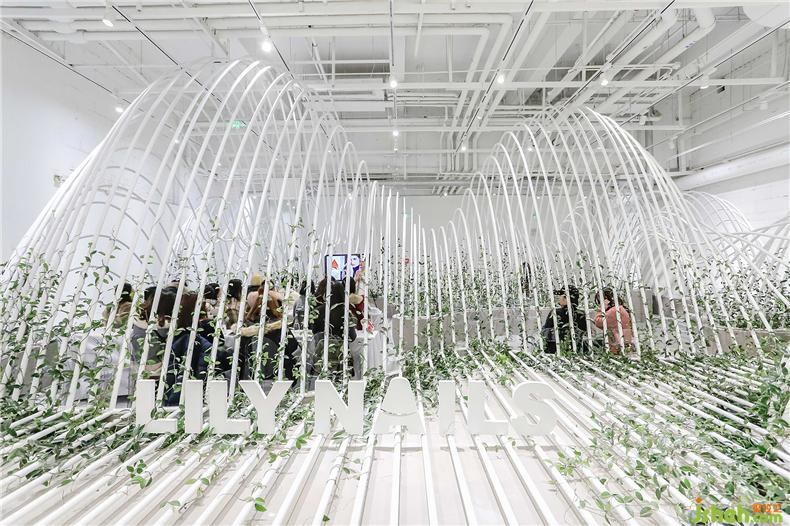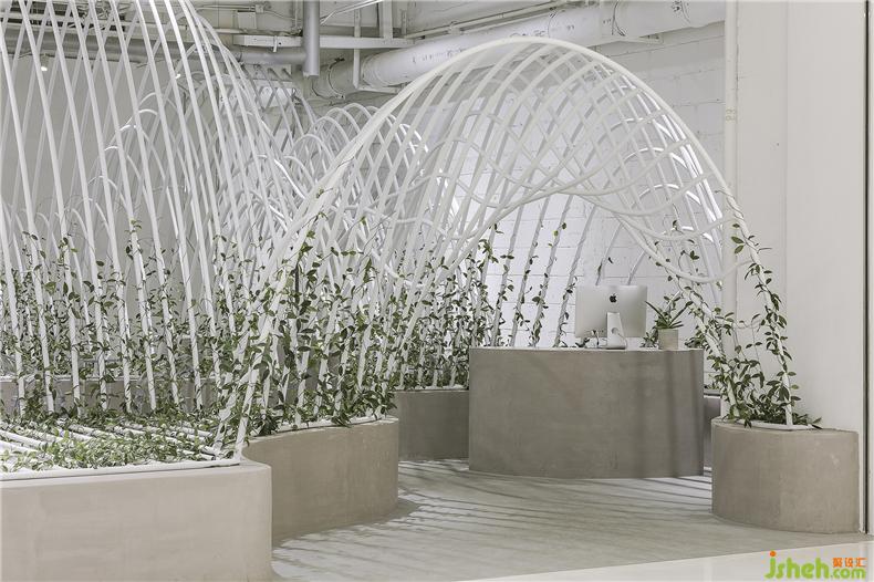 設計首先將整體空間劃分為公共和私密兩部分。室內(nèi)設計師公共部分為開放植物園。根據(jù)接待、等候、美甲、活動等功能生成10個大小不一的“山丘”,“山丘”互相聯(lián)通形成開放流動的路徑,使用直徑32mm、壁厚3mm的白色鍍鋅鋼管勾勒出連綿起伏的“山丘”輪廓,從地面升起的550mm高水泥臺,將抽象的“山丘”輪廓放置其上,沿水泥臺四周布置爬藤植物,室內(nèi)設計師綠色的球蘭藤蔓沿著“山丘”的輪廓線生長,生機盎然的提醒著時間和空間的變化。