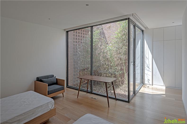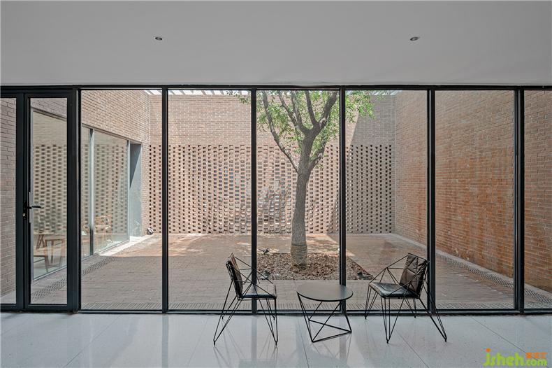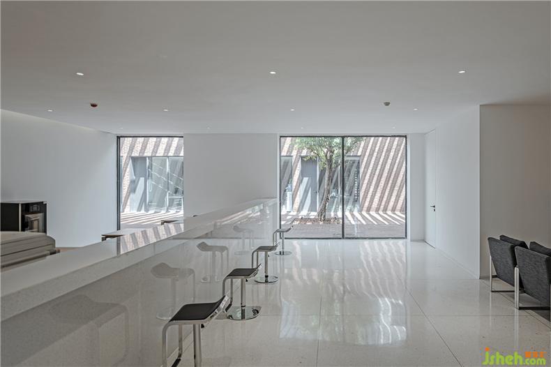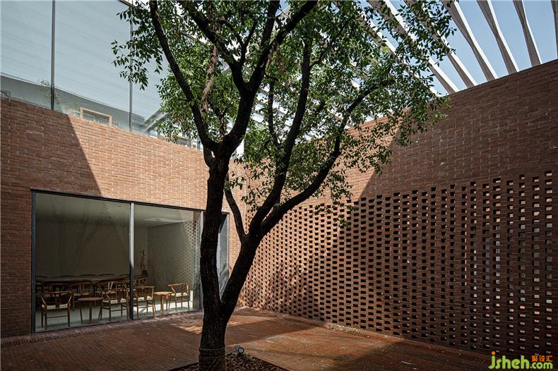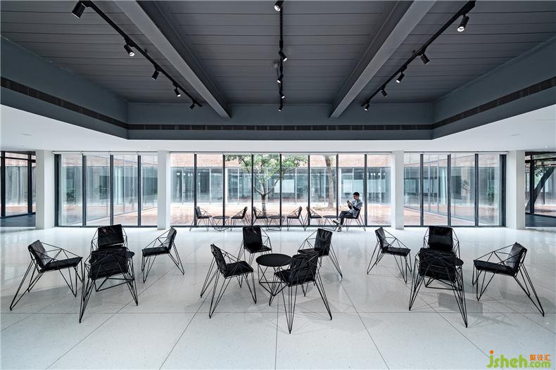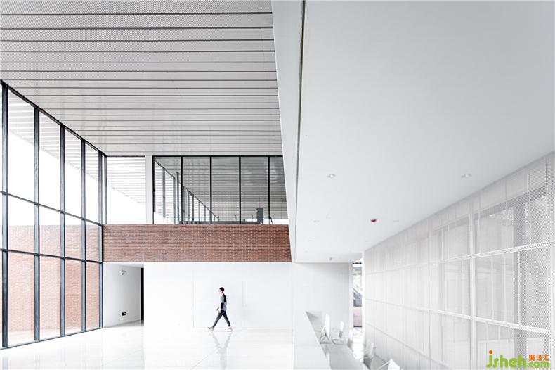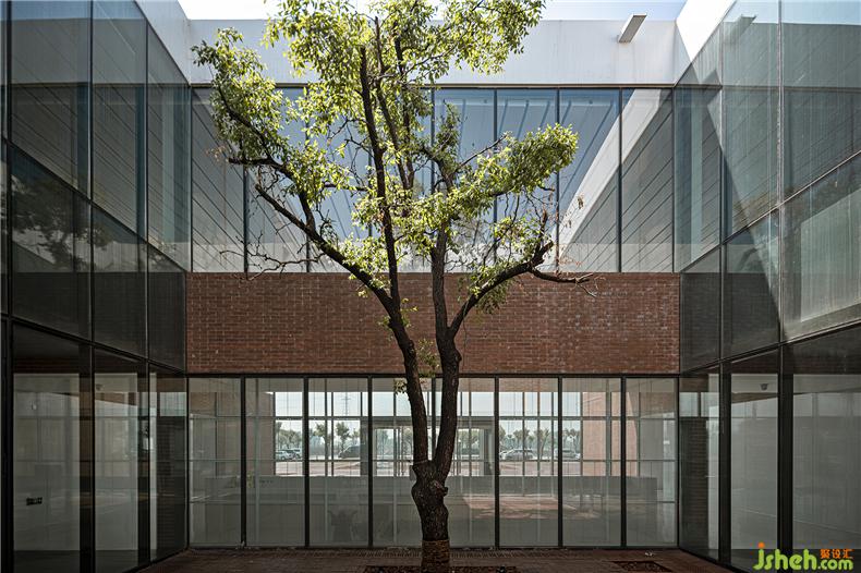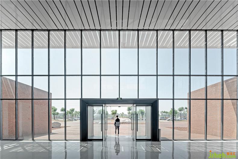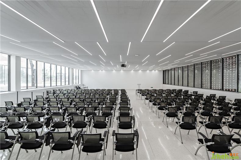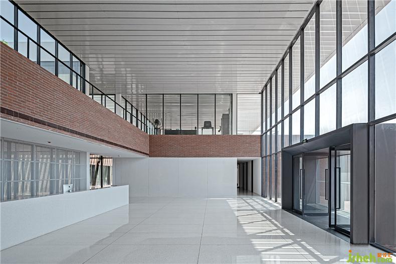 一片面積約4000平米的平屋頂+遮陽格柵覆蓋了整個建筑場地。辦公室設計屋頂遮陽格柵設計意象來自于周邊農田景觀的線性肌理,并結合方格網結構與平直樓板產生“柔化”的效果。遮陽格柵會產生由建筑中心向兩邊產生由密到疏的漸變排列,每一條格柵本身也存在著弧形的寬度漸變,同時鋁制格柵表面穿孔以弱化實體感,由此將鋼結構屋面與遮陽系統(tǒng)結合為一個整體的大屋頂。半透明感的屋頂宛如陽光下一片巨大的燈罩,其下的建筑和庭院自然演變?yōu)楣庥暗纳帧?臻g跟隨著一天之中陽光的變化,光影的韻律交織疊合,與人的活動一起共同演繹生動的自然場景。