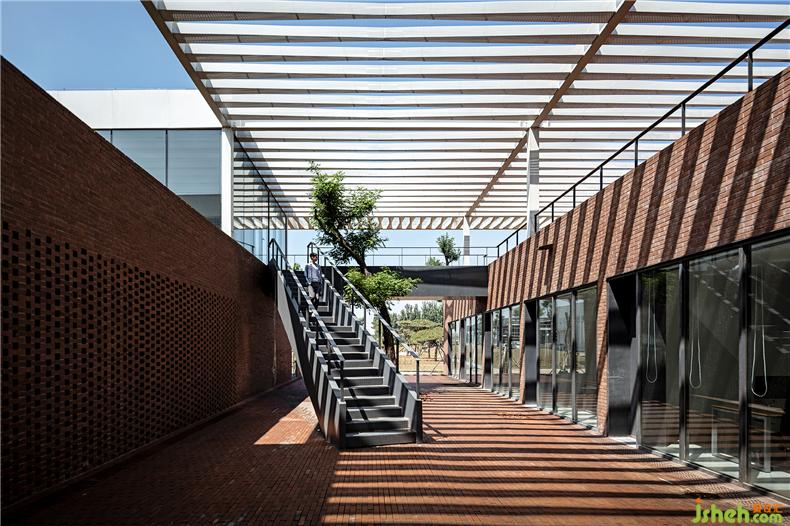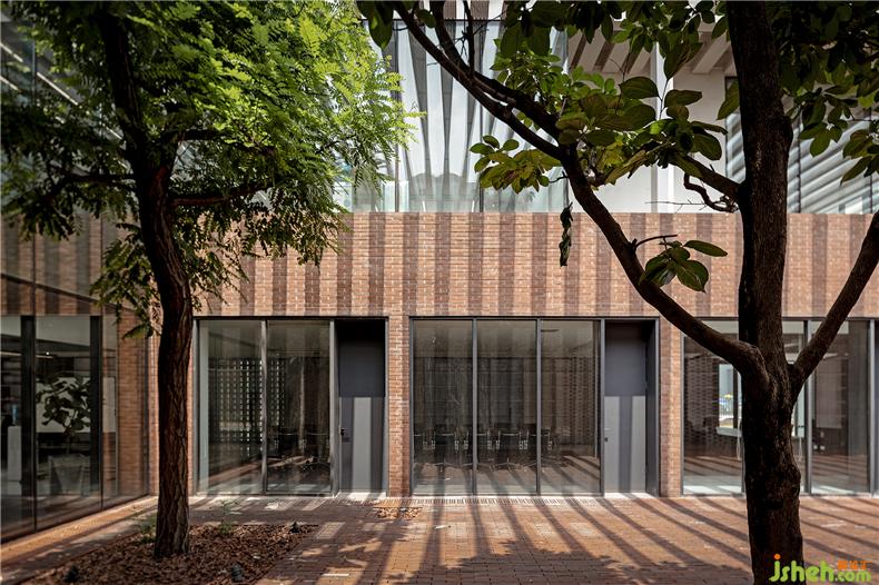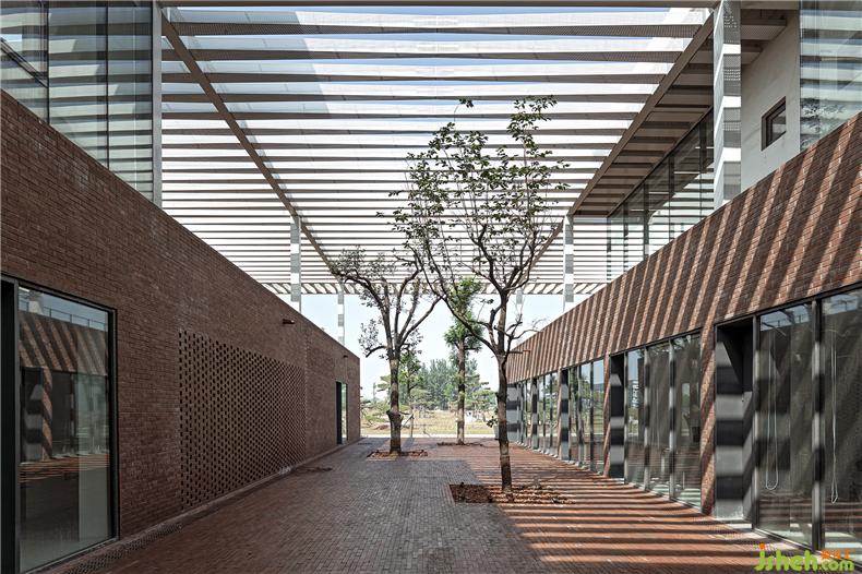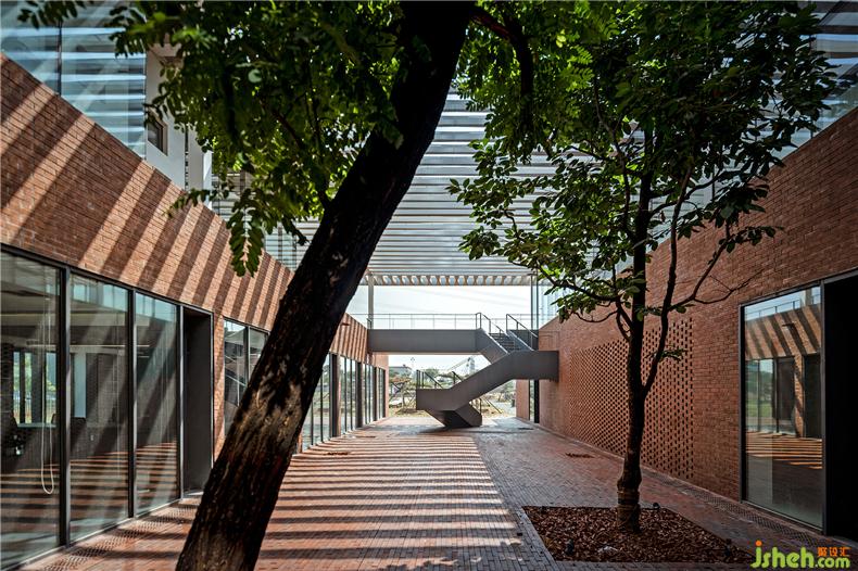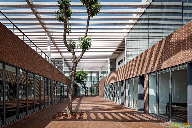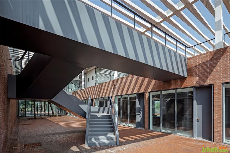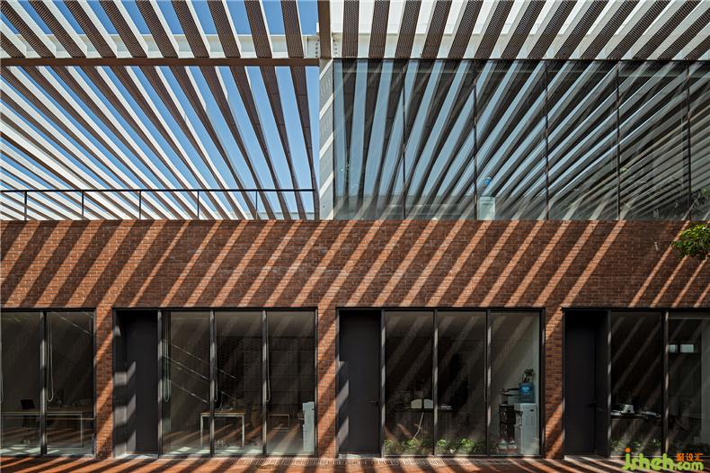 建筑在材料使用上較為克制,注重材料與空間的邏輯關(guān)系、辦公室設(shè)計內(nèi)外的一體化以及材料語言自身的表現(xiàn)力。建筑的前廣場、首層外墻和二層樓面均使用了紅磚這一該地區(qū)歷史建筑較為典型的材料,結(jié)合辦公樓建筑形態(tài)構(gòu)成了由南向北連續(xù)起伏的磚肌理地表。紅磚的砌筑方式與所在位置、開口方式、功能要求密切相關(guān),并在磚地表的不同區(qū)域產(chǎn)生凹凸、錯疊、滲透等的變化。在磚盒子界面之間,室內(nèi)外連橋、樓梯、門窗框以及部分室內(nèi)臺面等均采用鋼板材料,部分室外地面還做了防滑處理。辦公室設(shè)計磚盒子的內(nèi)部被處理為統(tǒng)一的淺色背景,使用了水磨石、涂料等。在磚盒子之上,二層空間內(nèi)外均使用穿孔鋁制格柵吊頂,照明、空調(diào)、設(shè)備等管線隱藏其中,形成完整的空間界面,與粗糙的磚表面形成對應(yīng)。