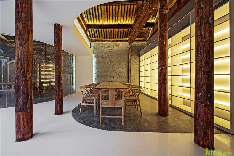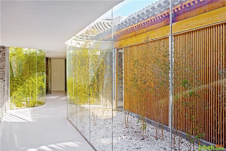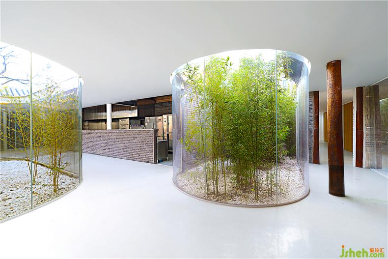 2.植入新的。舊有的建筑格局難以滿足當(dāng)代環(huán)境的舒適性要求,室內(nèi)設(shè)計(jì)師新的建筑必須能夠完全封閉以抵御外部的寒冷。為此,我把建筑中的流線視覺化,轉(zhuǎn)化為“廊”的形式,在舊有建筑的屋檐下加入一個(gè)扁平的“曲廊”將分散的建筑合為一體,創(chuàng)造新舊交替、內(nèi)外穿越的環(huán)境感受。在傳統(tǒng)建筑中,廊是一種半內(nèi)半外的空間形式,它的曲折多變、高低錯(cuò)落,大大增加了游園的樂趣。猶如樹枝分岔的曲廊從室外伸展到舊建筑內(nèi)部,模糊了院與房的邊界,改變院子呆板狹窄的印象。輕盈、透明、純白的廊空間與厚重、滄桑、灰暗的舊建筑形成氣質(zhì)上的反差,新的更新、老的更老,拉開時(shí)間上的層疊,新與舊相互產(chǎn)生對話。曲廊在原有院子中劃分了三個(gè)錯(cuò)落的弧形小院,使每一個(gè)茶室有獨(dú)立的室外景致,在公共和私密之間產(chǎn)生過渡。曲廊的玻璃幕墻好似一個(gè)懸浮地面之上的弧形屏幕,茶樓設(shè)計(jì)將竹林景觀和舊建筑形式投射到茶室之中,新與舊的影像相互疊加。曲廊同時(shí)具有舊建筑的結(jié)構(gòu)作用,廊的鋼結(jié)構(gòu)梁柱替換了局部舊建筑中腐朽的木材,使新與舊“長”在了一起。