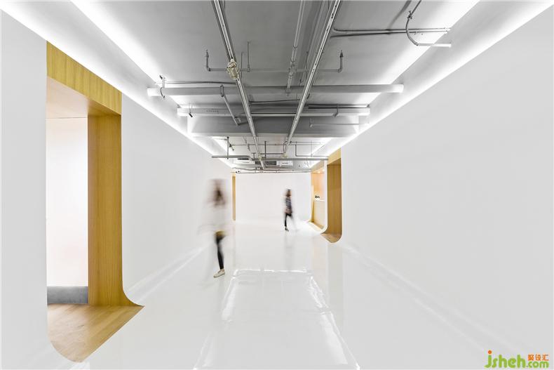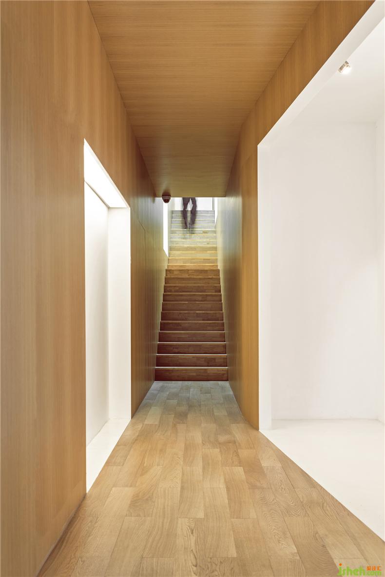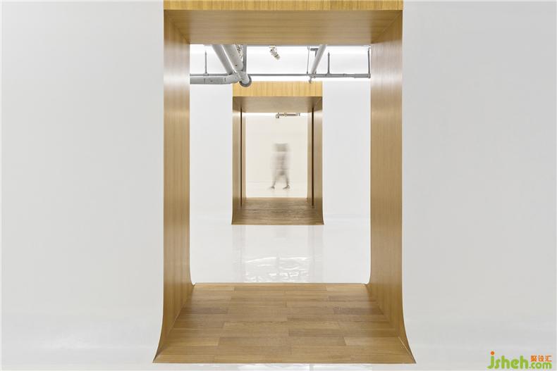 設(shè)計(jì)目的:門面以6米高的白色鋼板墻取代了以前的玻璃立面構(gòu)成嶄新的入口形象,室內(nèi)設(shè)計(jì)師加強(qiáng)畫廊外觀的識別性。室內(nèi)設(shè)計(jì)圍繞三個規(guī)整的長方形展廳展開。展廳猶如抽象的白色艙體,柔和的弧形轉(zhuǎn)角模糊了墻面與地面的邊界,使視覺空間最大化。展廳頂部直接暴露結(jié)構(gòu)管線以獲取最大的高度。展墻與原有空間邊界剩余的部分則成為“空心墻”-一系列由橡木飾面板包裹的服務(wù)空間,室內(nèi)設(shè)計(jì)師包括前臺、辦公、茶室、樓梯、衛(wèi)生間等,這些小尺度的房間盡量采用隱蔽光源和可觸摸的材質(zhì),安寧、溫暖的感受與光滑亮白的展廳構(gòu)成反差,置身其中仿佛窺視者墻體的內(nèi)部。