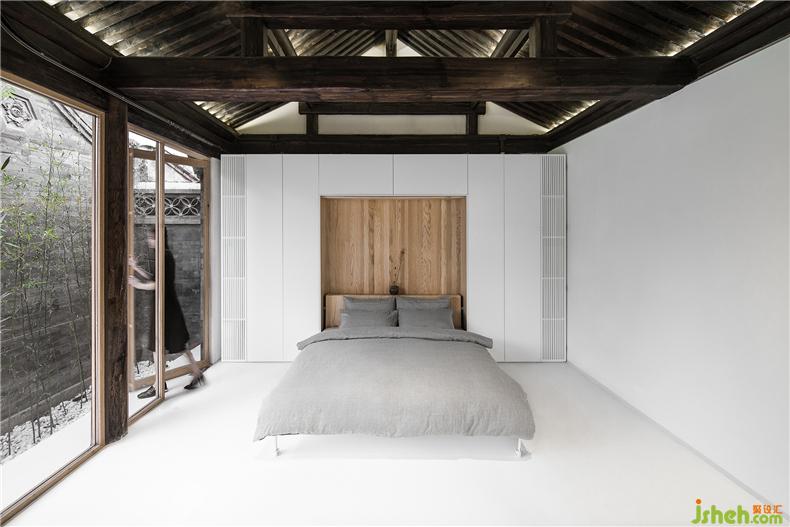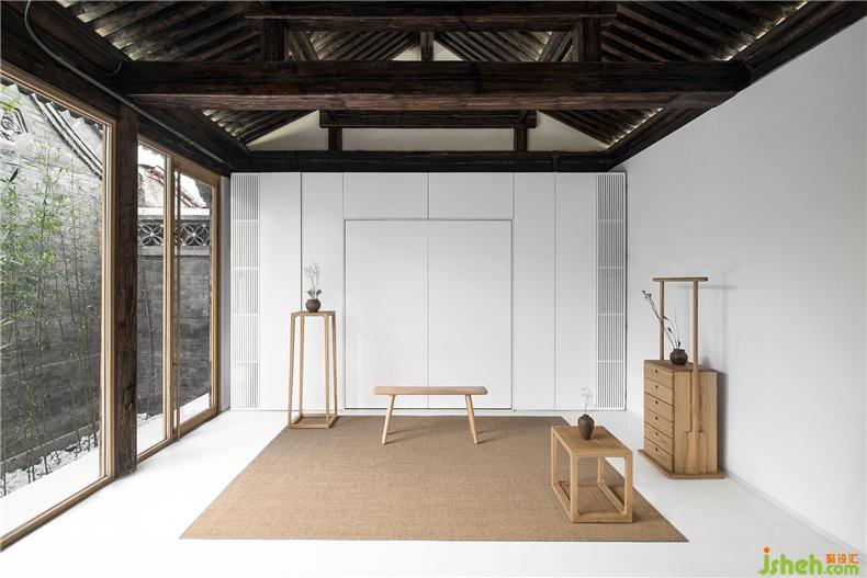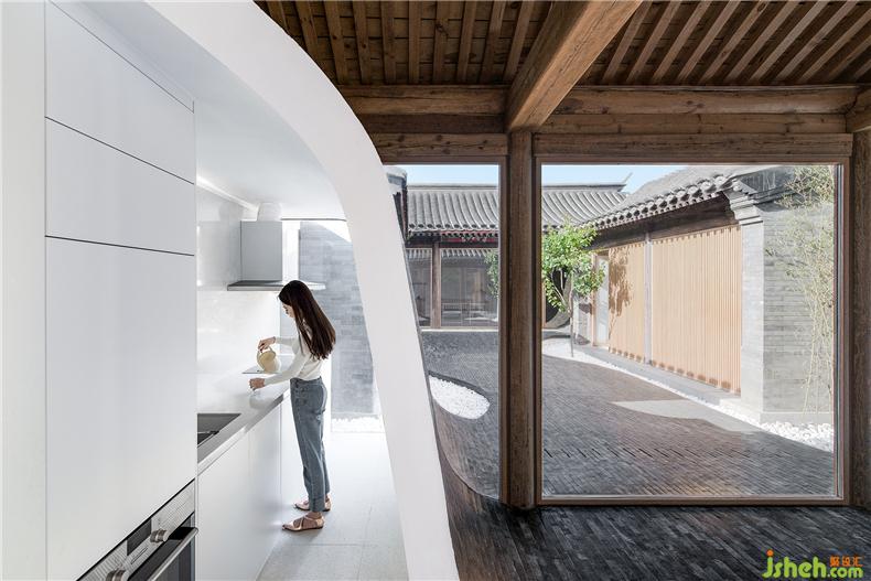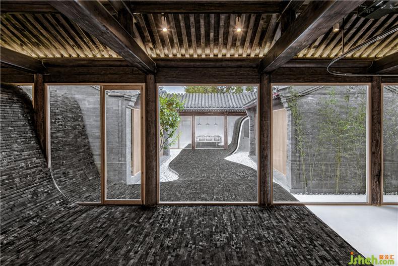 改變原本四合院的莊重、刻板的印象,營造開放、活躍的院落生活氛圍。別墅裝飾基于已有院落格局,利用起伏的地面連接室內(nèi)外高差并延伸至房屋內(nèi)部扭曲成為墻和頂,讓內(nèi)外空間產(chǎn)生新的動態(tài)關(guān)聯(lián)。隱于曲墻之內(nèi)的是廚房、衛(wèi)生間、庫房等必要的服務(wù)性空間;顯于曲墻之外的會客、餐飲空間與庭院連接成為一個整體。室內(nèi)外地面均采用灰磚鋪就,院中原有的一顆山楂樹也被保留在扭動的景觀之中。