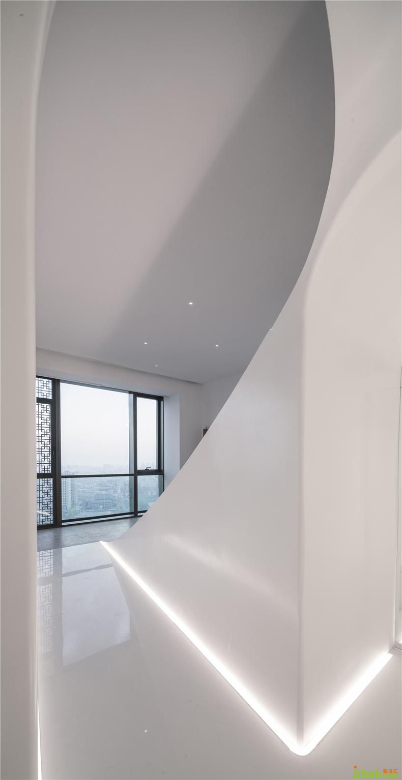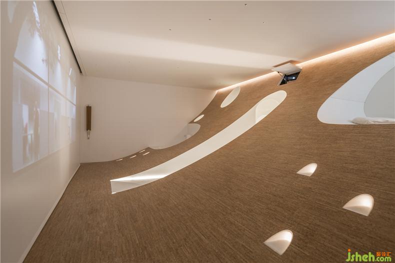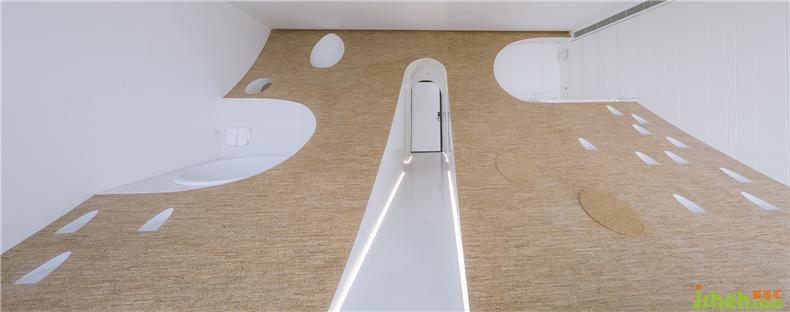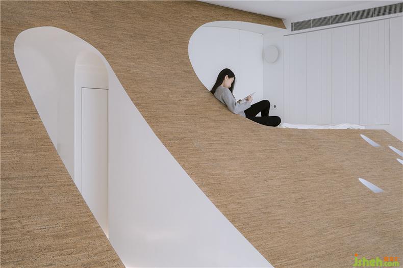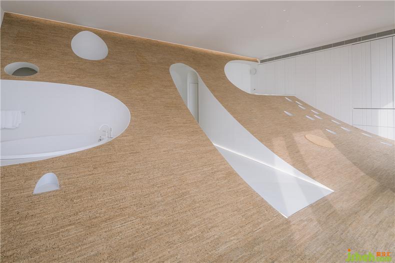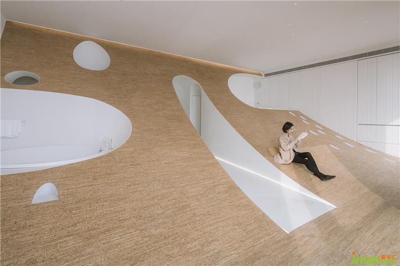 在規(guī)整的長方形室內(nèi)空間之中,室內(nèi)設(shè)計師地面由窗邊向內(nèi)緩緩抬升成為一個山坡,讓內(nèi)部人的行為與窗外景色產(chǎn)生立體的對應(yīng)關(guān)系。生活起居的五種基本行為:入、臥、憩、浴、衛(wèi)被嵌入在這片人造山坡之中。山下的洞穴是入口和衛(wèi)生間,山上視野最佳的位置是睡覺和洗浴的地方,山坡則是行走、休憩的界面。室內(nèi)設(shè)計師山的表面材料是軟木地板,具有柔軟、溫暖的質(zhì)感。洞穴可以被看作是定制的家具,由身體尺度和行為進(jìn)一步定義出使用功能。一些當(dāng)代生活的必要設(shè)施,室內(nèi)設(shè)計師包括智能設(shè)備、全屏投影等被隱藏在墻面和天花中,滿足生活所需。