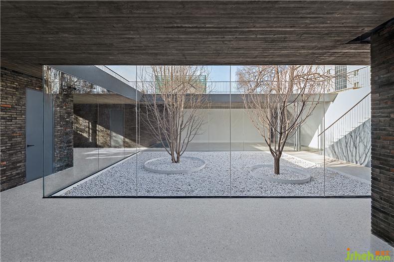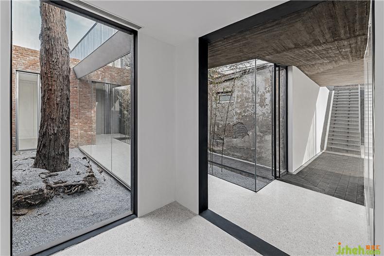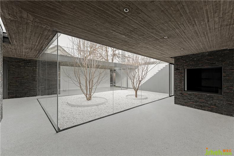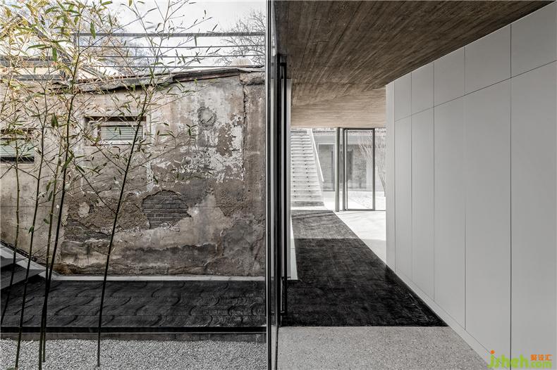 基于平屋頂建筑的特點,設計在舊有建筑平面格局上添加了連廊和樓梯,別墅裝飾將屋頂與地面、房屋與庭院相互串聯(lián),成為一條可通達賞玩的折疊循環(huán)路線,讓建筑的內(nèi)與外、上與下、新與舊產(chǎn)生互動關系。平屋頂是一處在四合院區(qū)域難得的公共活動場地,也是內(nèi)部功能使用的重要延伸,屋頂景觀與周邊復雜多樣的坡屋頂建筑和樹木形成有趣的對應。別墅裝飾圍繞折疊的環(huán)線,由入口向內(nèi)部自然劃分出四個不同尺度的庭院——入口處狹長的竹院;保留原有老槐樹的樹院;清除原來玻璃頂,并置入水景、卵石的水院;以及保留南向與鄰里過渡的后院。因此,在這個空間游走將伴隨著不斷變化的景致。保留原有建筑的兩處磚房子,別墅裝飾并新增三處磚盒子則作為私密空間,功能分別被設定為休息室、廚房、衛(wèi)生間等。盒子之間構成連續(xù)而又分離的公共區(qū)域,可容納辦公、聚會、餐飲等活動。磚盒子墻體內(nèi)部隱藏著屋面的結構,設計有意讓屋面與磚盒子墻面脫開產(chǎn)生天光的縫隙,令二者獨立并置。項目沿用了四合院常見的舊磚、青瓦、水泥等作為主要材料。屋面均為立砌青瓦鋪裝,青瓦按照屋頂不同方向線性排布,并跟隨樓梯連接到室內(nèi),產(chǎn)生如流水一般的視覺效果。別墅裝飾屋面為現(xiàn)澆混凝土板,室內(nèi)表面保留了木紋模板的自然紋理。磚盒子則是由附近院落拆除的舊磚砌筑的,由墻面延伸到屋頂并形成了休息座椅。